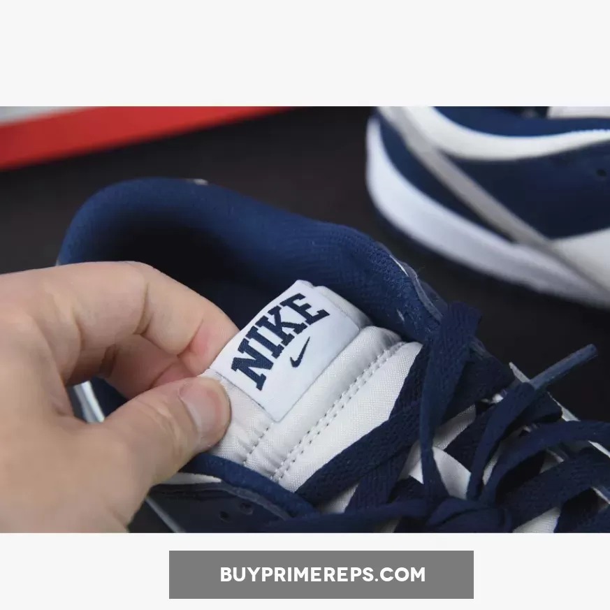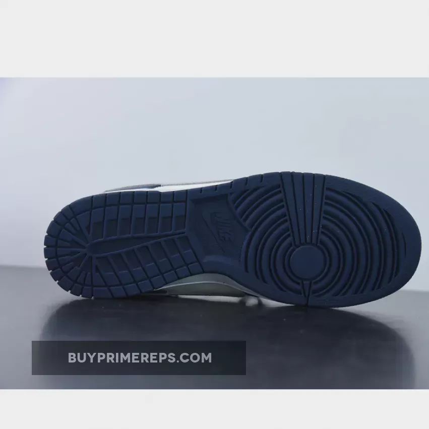 Crafted with meticulous attention to detail, the upper of the Nike Dunk Low is assembled from panels of premium leather in fresh white and navy blue. The contrasting colors create a striking visual impact, while the high-quality materials ensure durability and comfort. The navy overlays add depth and dimension to the design, while the white base provides a clean and crisp backdrop.