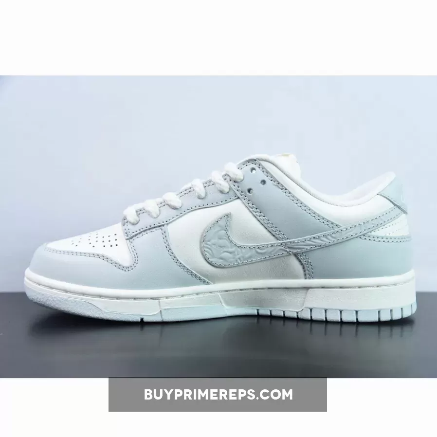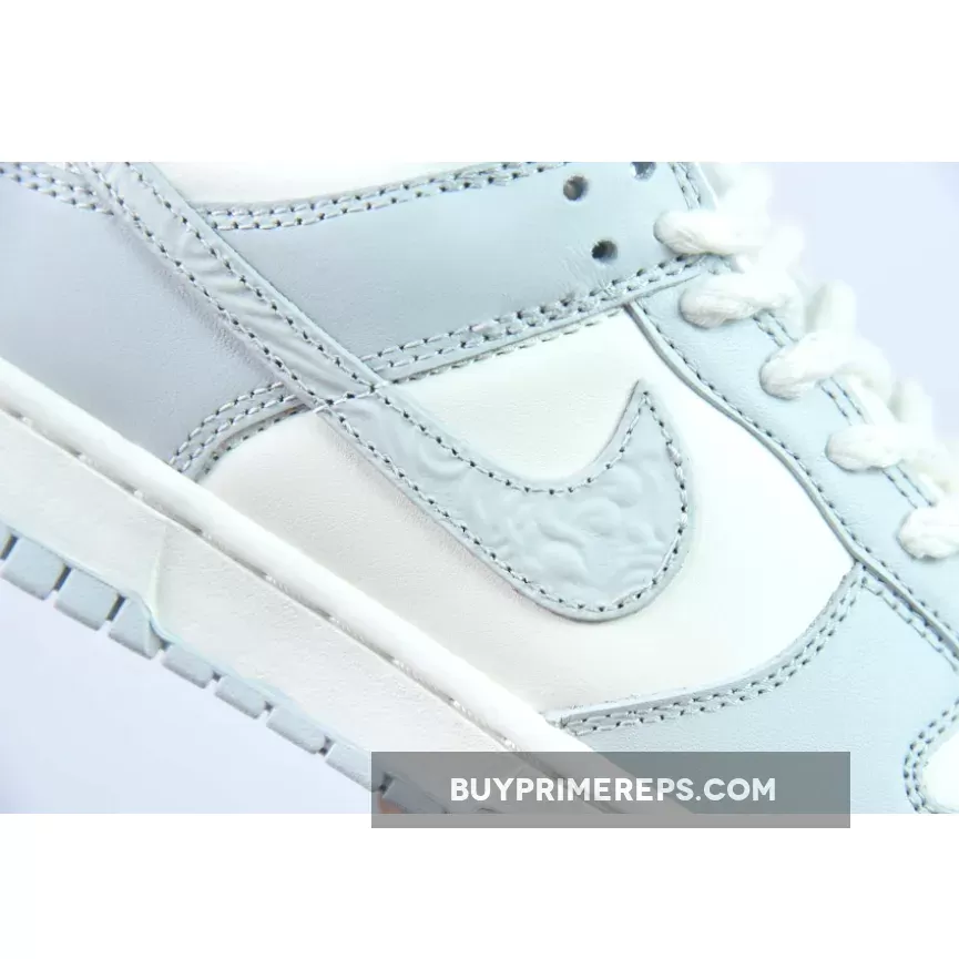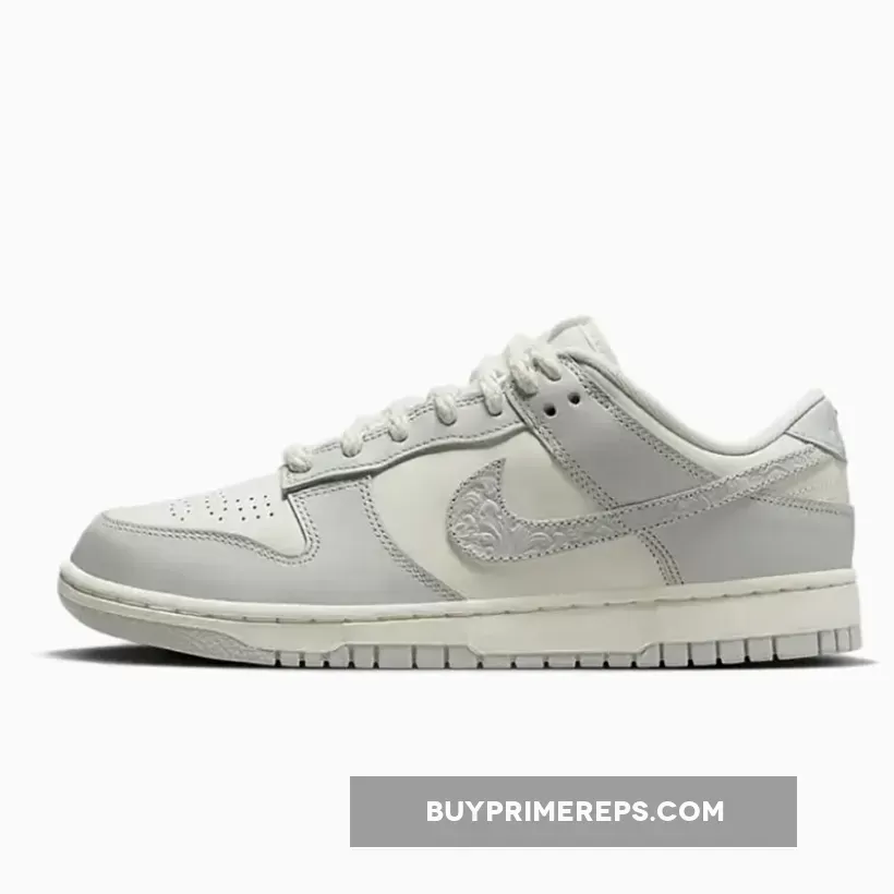 The Nike Dunk Low “Needlework” is a sneaker that combines classic design with intricate details. At first glance, it may appear to be a simple grey Dunk Low, but upon closer inspection, the attention to detail becomes evident. The shoe features a leather upper in a combination of Sail and grey, giving it a clean and versatile look.