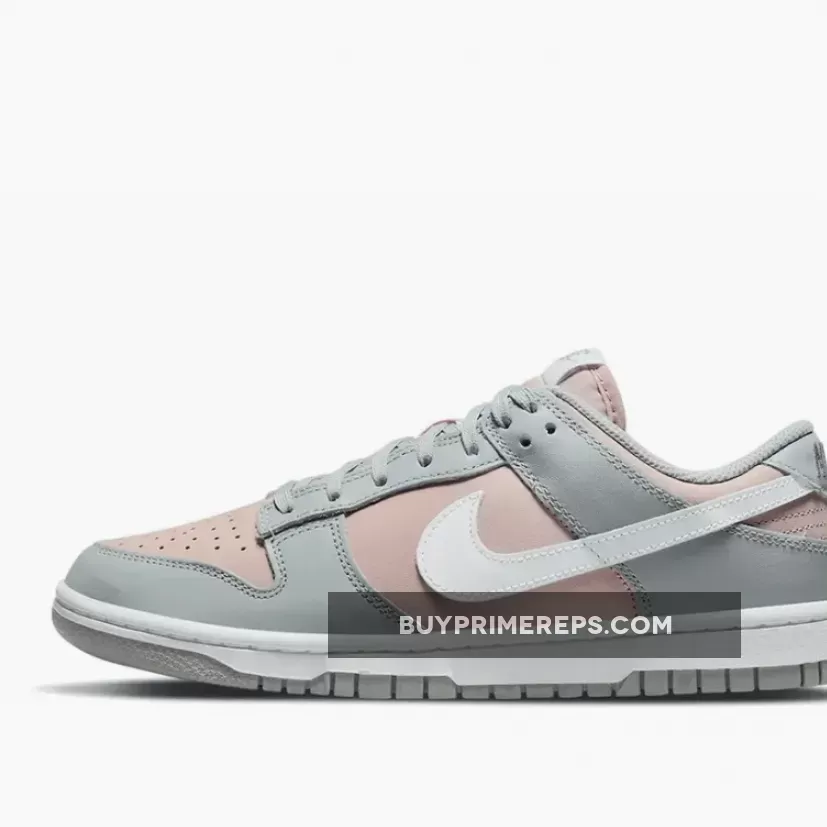 This particular iteration of the Nike Dunk Low features a low-top profile, offering an easy-to-style and streamlined look. The upper is constructed with a combination of smooth pink leather and grey leather overlays. The pink and grey color scheme extends to the nylon tongues and insoles, creating a cohesive and visually pleasing design.