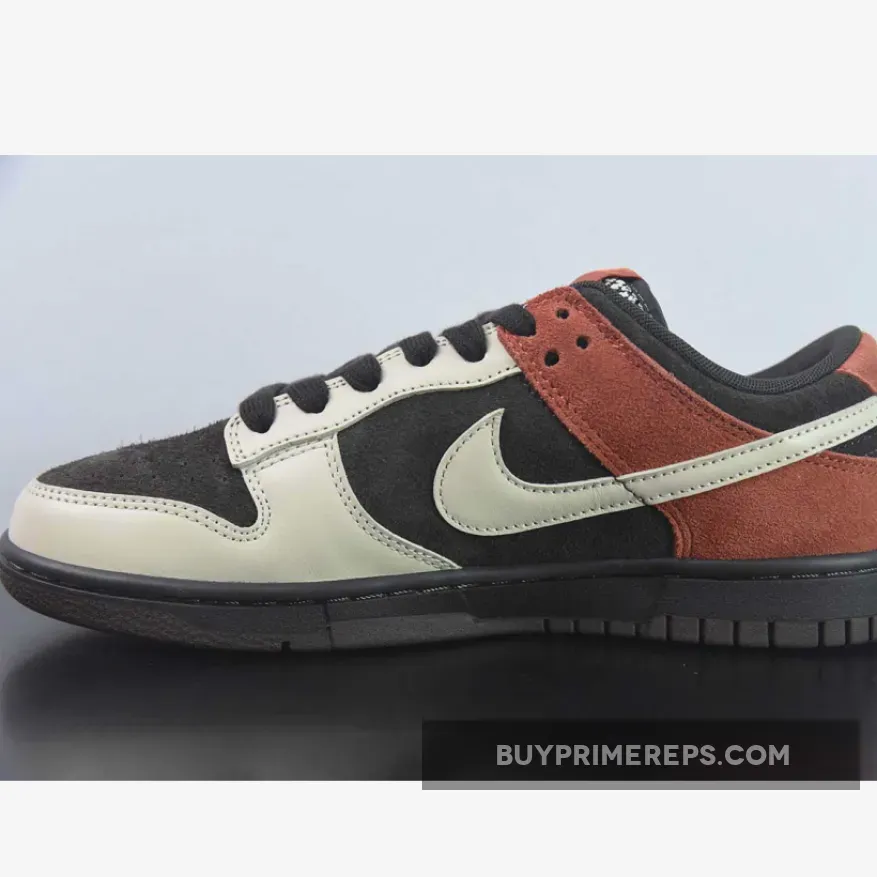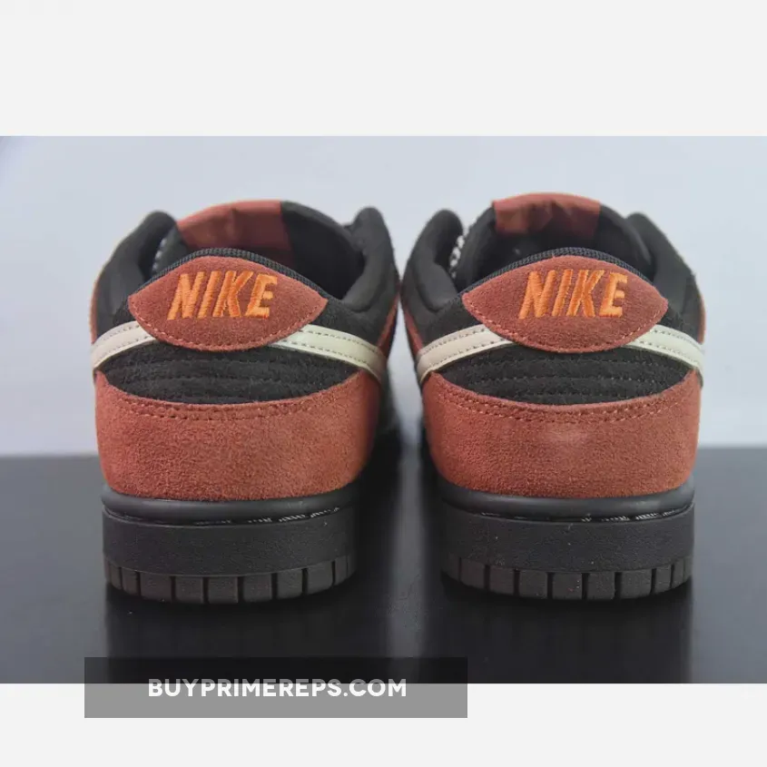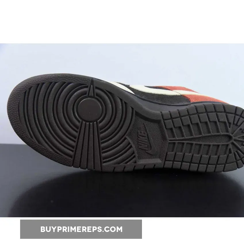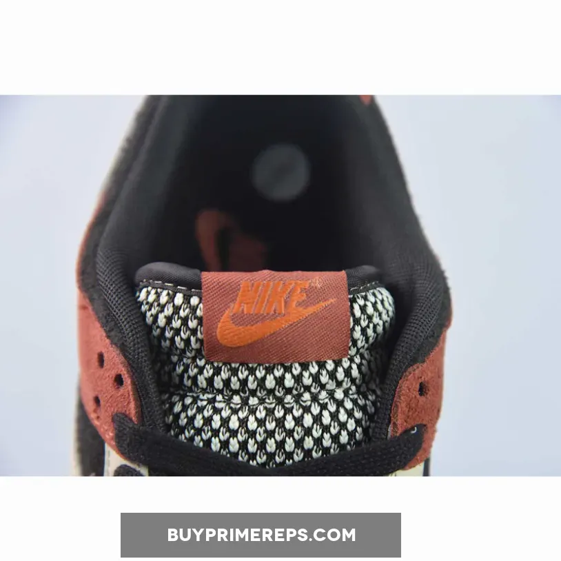 The upper of the Nike Dunk Low “Red Panda” features a combination of fabric and leather materials. The base layers have a terrycloth-like finish, adding a touch of texture to the shoe. The predominantly dark arrangement is contrasted by off-white and orange accents that appear on the forefoot, sides, and heel. These pops of color add depth and visual interest to the overall design.