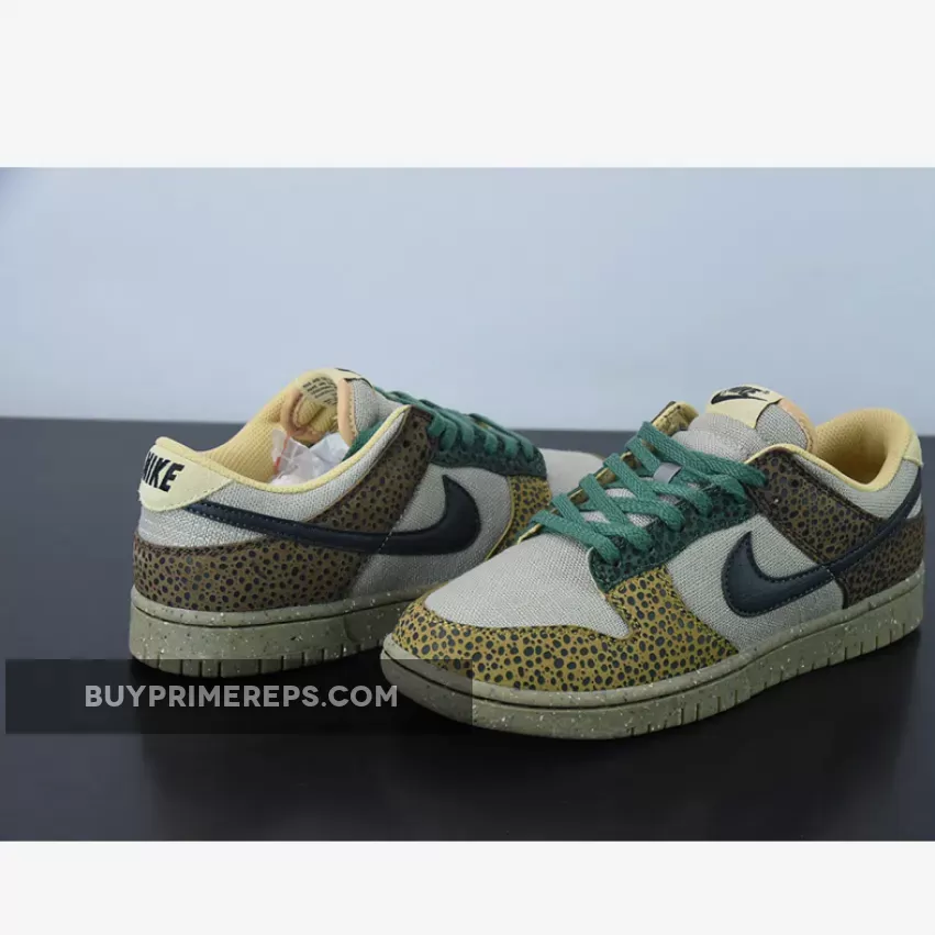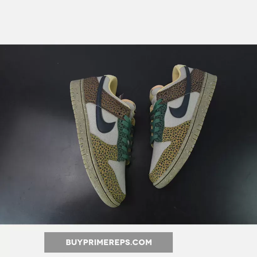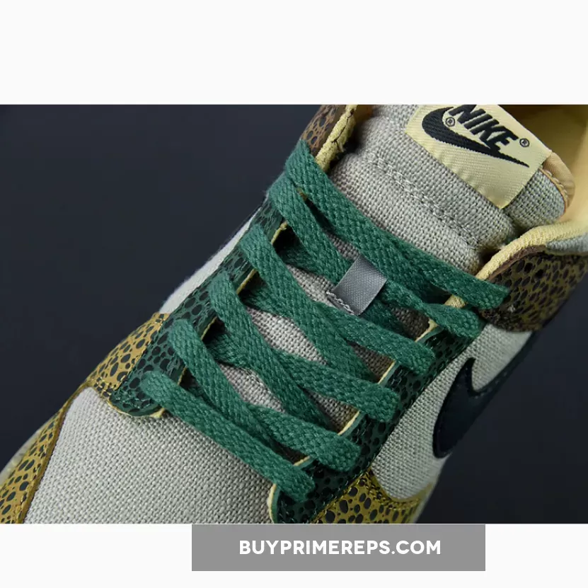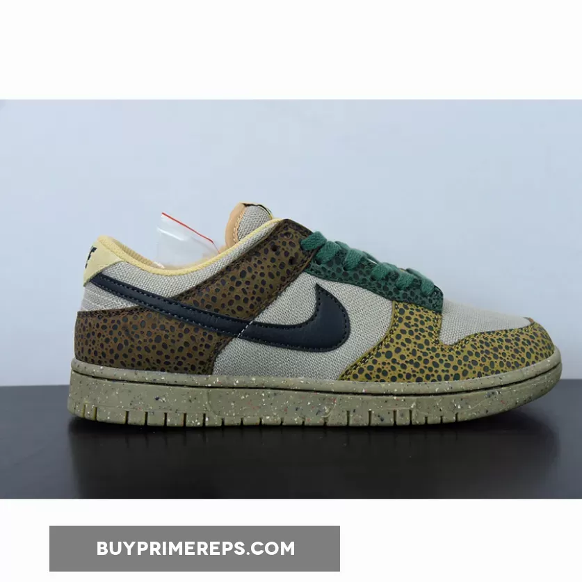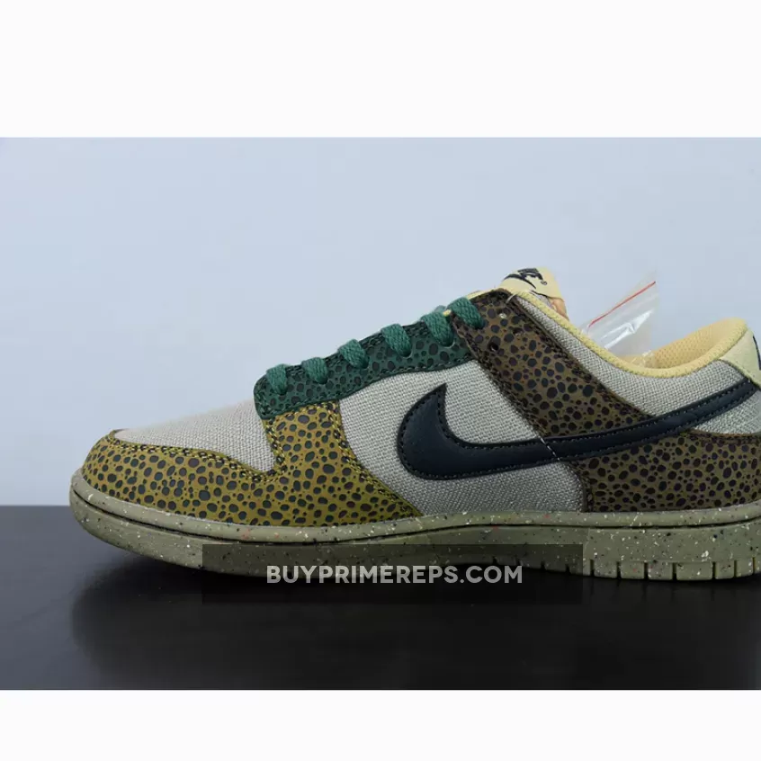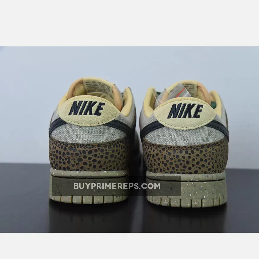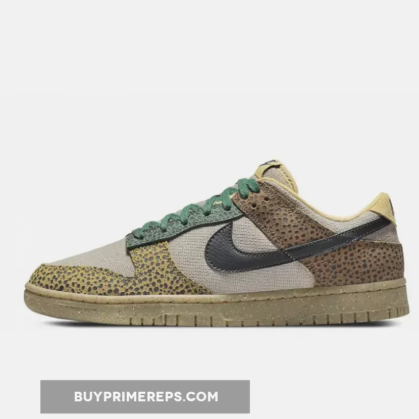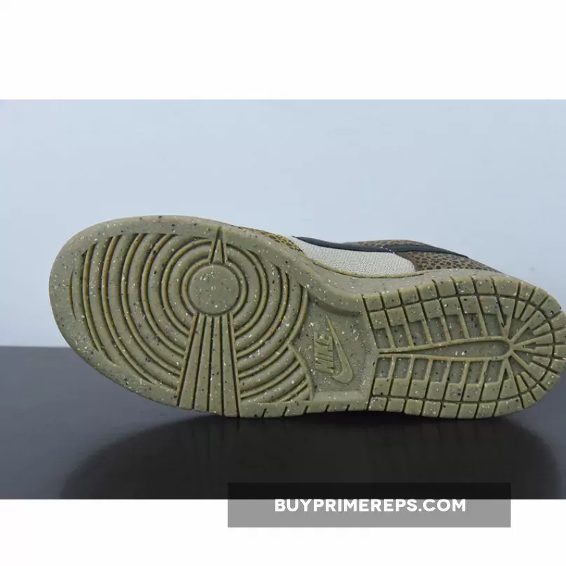 The upper of the Nike Dunk Low Safari Cacao Wow features a light brown hemp mesh base, providing breathability and comfort. But what sets this sneaker apart is the overlay design. Inspired by the patterns of a cheetah, the overlays feature Cheetah spots in different colors. The toe cap and mudguard sport a tan color, while the eyestay panel showcases a dark green hue. The foxing, on the other hand, is adorned with a rich brown shade. This combination of colors creates an eye-catching and dynamic look that is sure to make a statement.