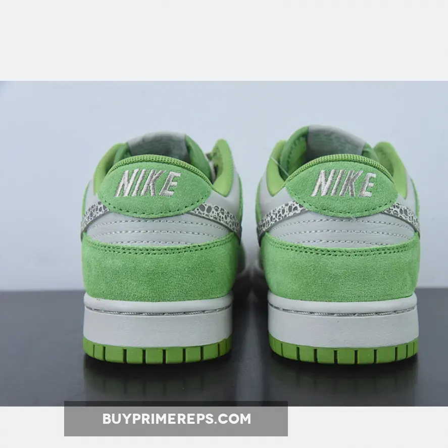 One of the standout features of the Nike Dunk Low “Chlorophyll” is the addition of safari printed Swooshes on the side panels. These leopard print accents bring a wild and adventurous element to the shoe, elevating its overall aesthetic. The combination of the green suede and leopard print creates a striking contrast that is sure to make a statement.