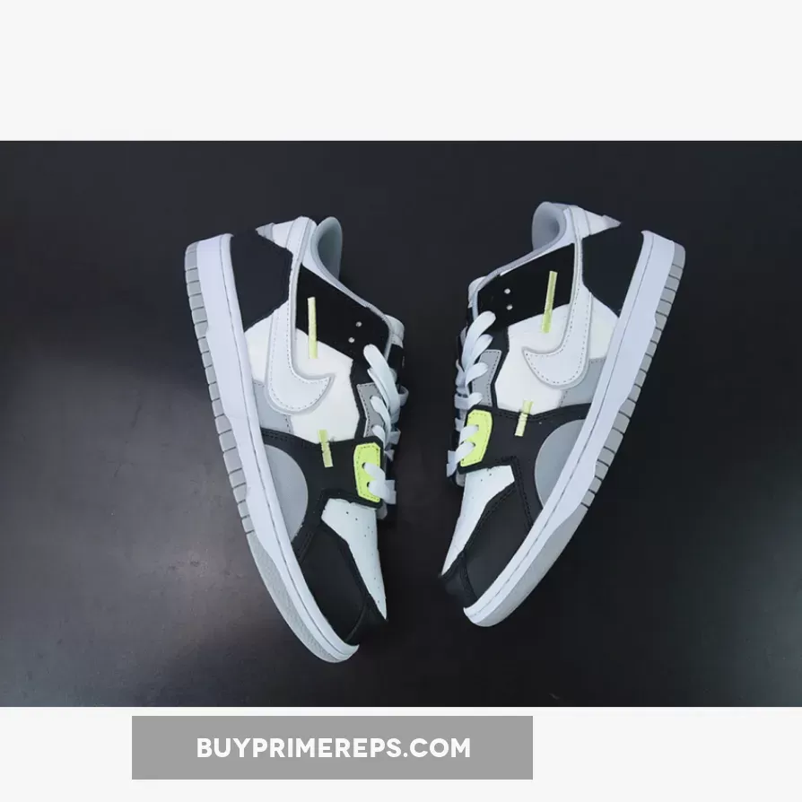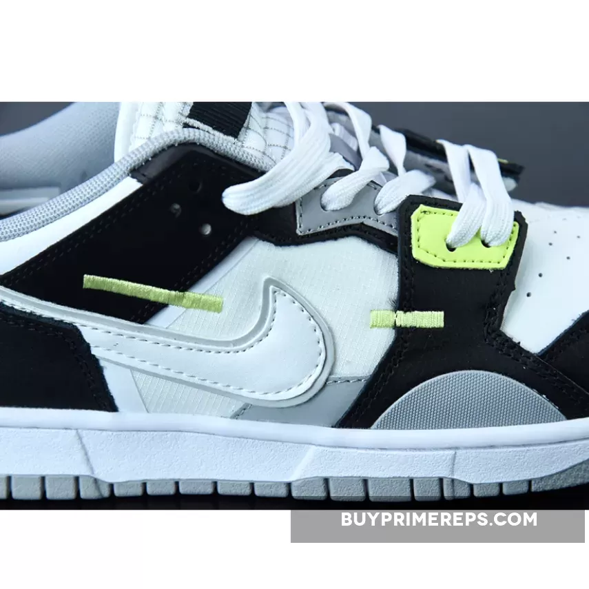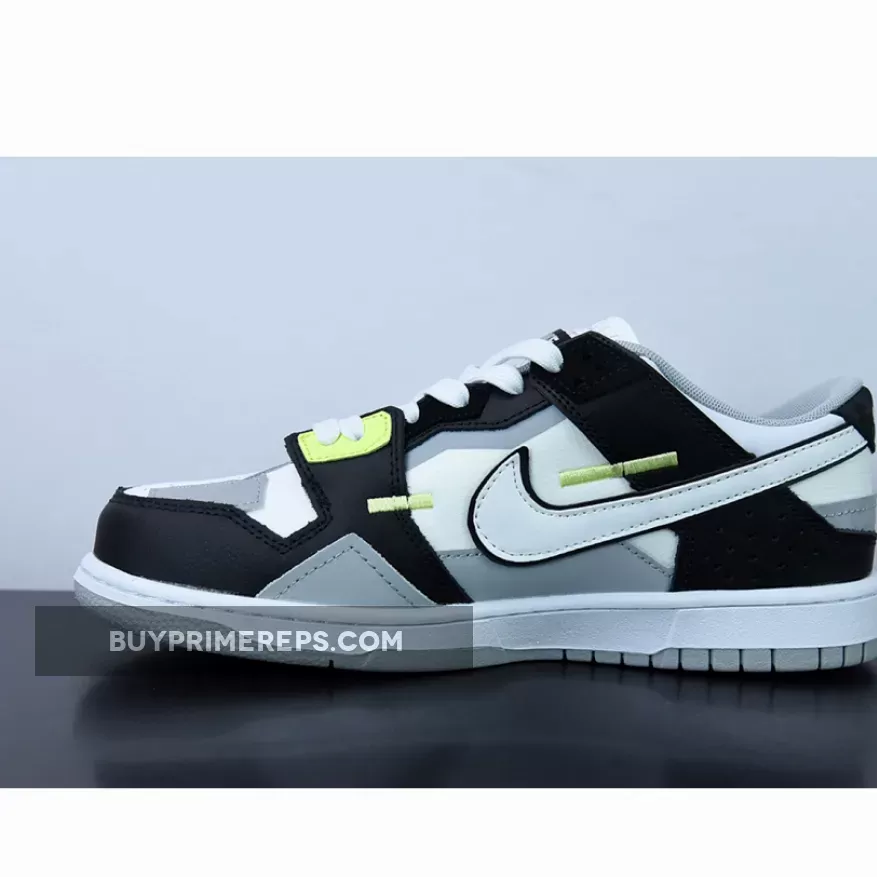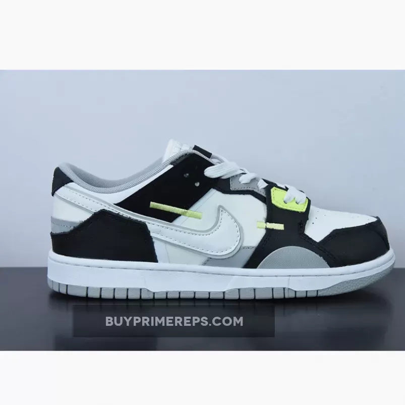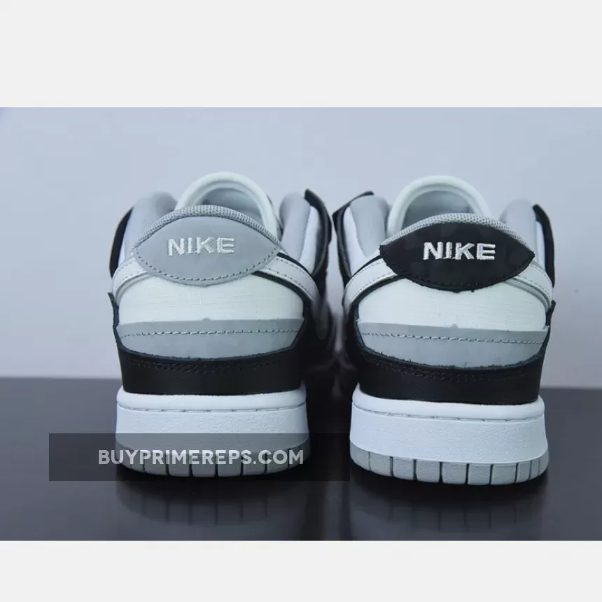 The upper of the Nike Dunk Low Scrap Grey is constructed with a combination of leather and mesh materials. The color palette revolves around a timeless “Black/White” scheme, which covers the majority of the shoe. The non-standard leather and mesh panels create an asymmetrical arrangement, adding a touch of uniqueness to the design.