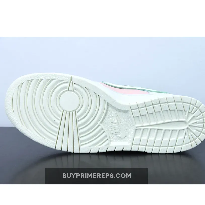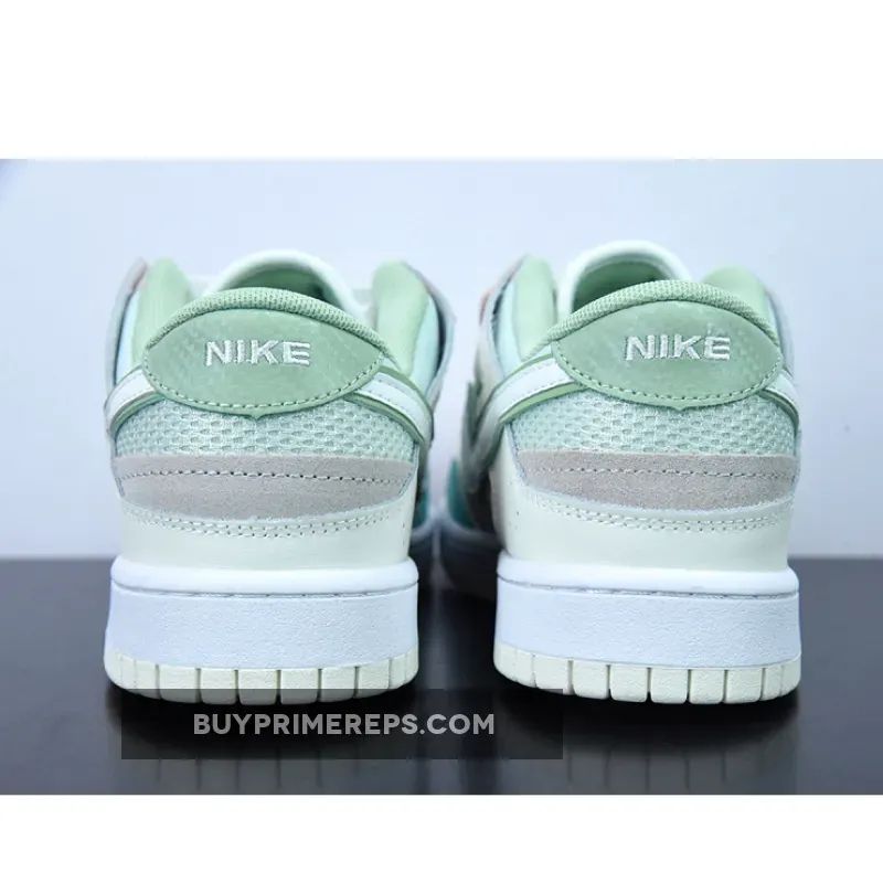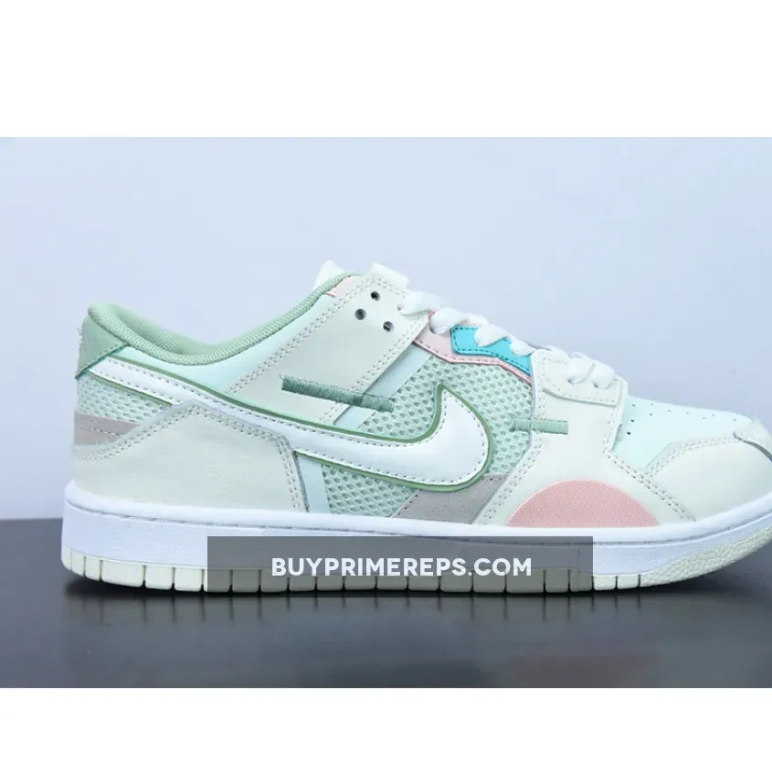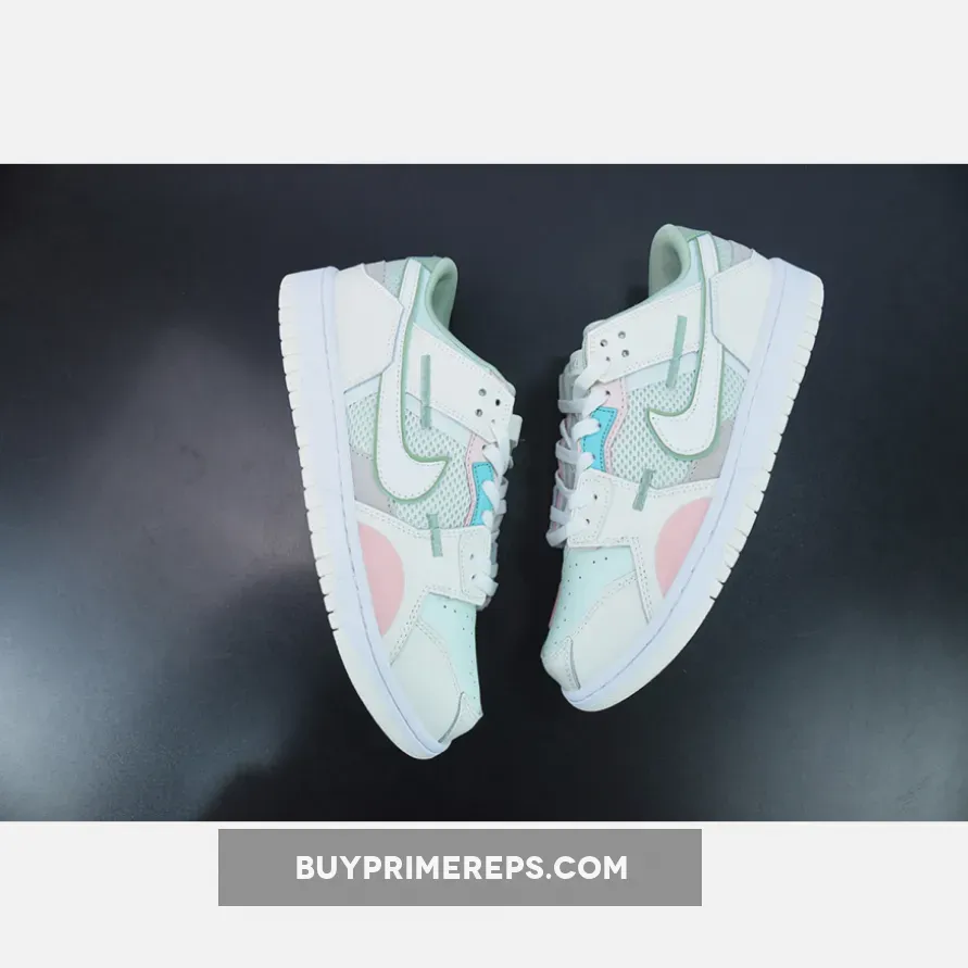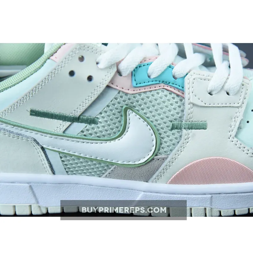 The color palette of the Dunk Scrap Grey Haze Phantom is a mix of muted tones and soft pastels. Hints of mint green and pink are sprinkled across the shoe, adding a subtle touch of color to the overall design. These colors give the shoe a soft and feminine vibe, contrasting with the ruggedness of its deconstructed look.