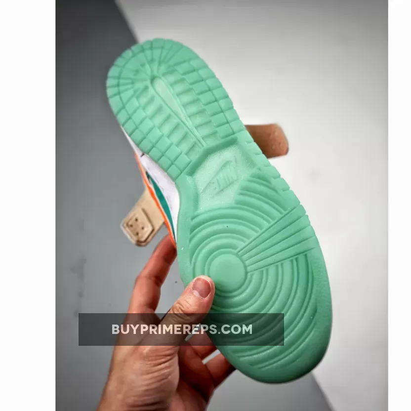 The Nike Dunk Low Scrap Shapeless Formless Limitless features a mix of high-quality materials including leather, suede, and mesh. This combination of textures adds depth and dimension to the shoe, creating a visually striking look. The upper is predominantly white, allowing the vibrant jade gem on the lateral heel to stand out even more.