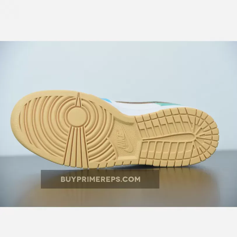 The upper of the shoe is constructed with smooth leather, providing a sleek and premium look. The design features a mix of colors arranged asymmetrically on each shoe, creating a mismatched aesthetic that adds an element of fun and playfulness to the design. The right shoe showcases aqua blue, pine green, buttery yellow, and scarlet red overlays, while the left shoe features a different arrangement of these colors. This asymmetry adds an interesting twist to the classic Nike Dunk silhouette.