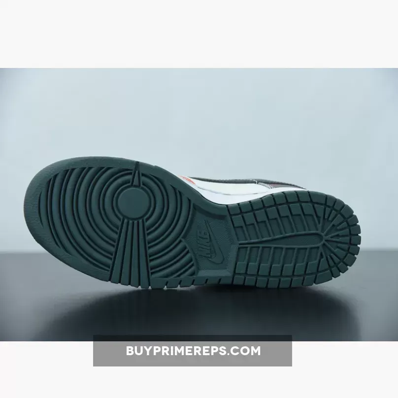 The Swoosh logo, sock lining, and rubber outsole all come in a dark forest green color. This helps to balance out the wild design of the upper and adds a touch of simplicity to the shoe. The heel tabs are branded, with the right pair featuring a basketball motif instead of the standard Nike spellout logo. This further emphasizes the mismatched theme of the shoe.