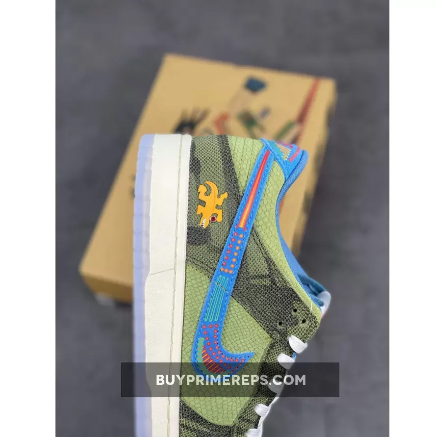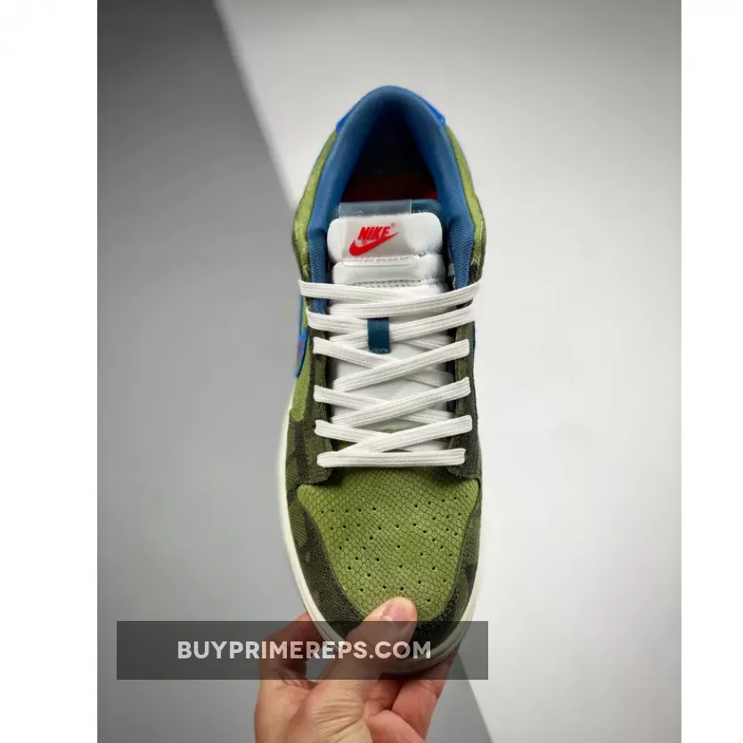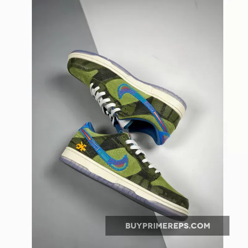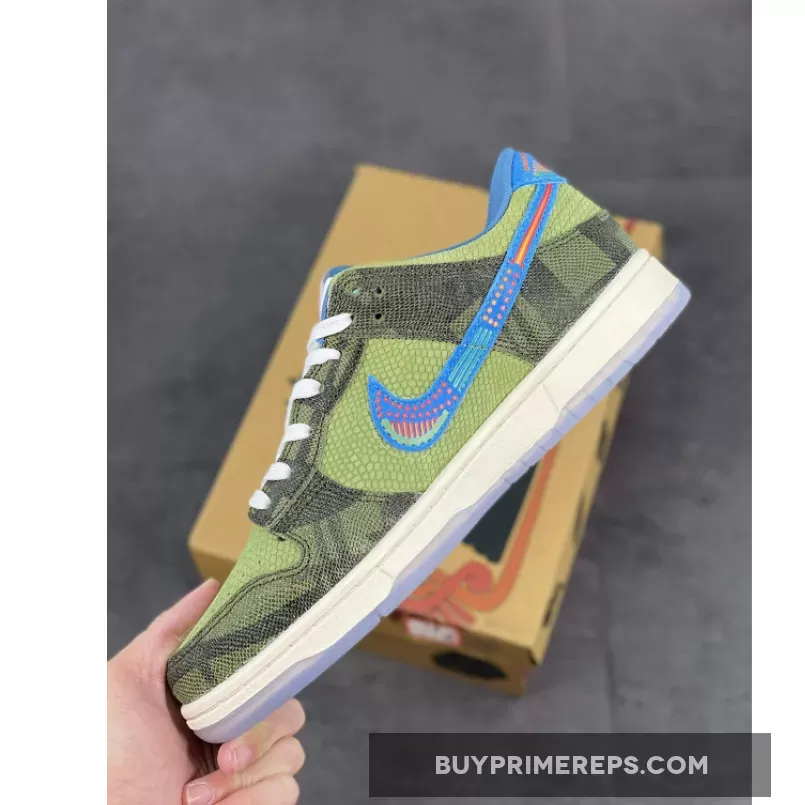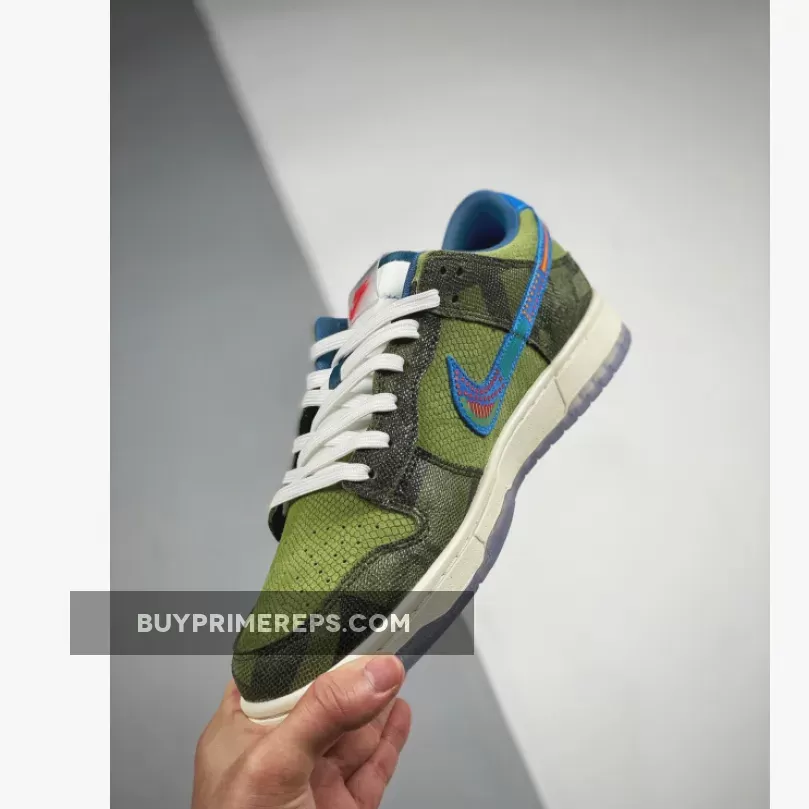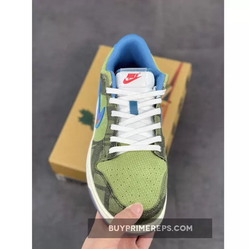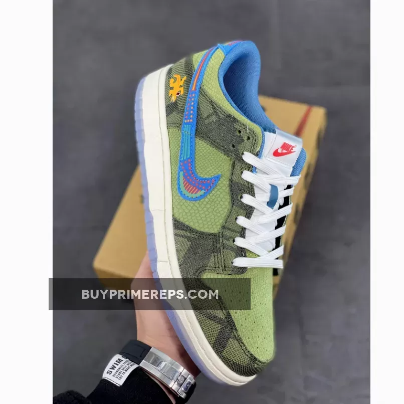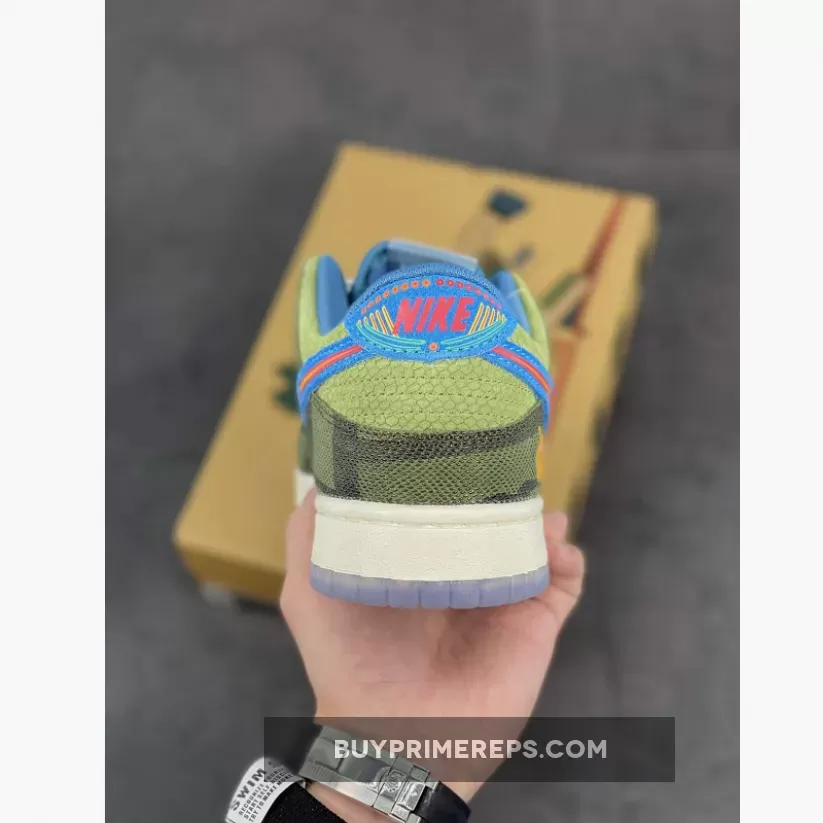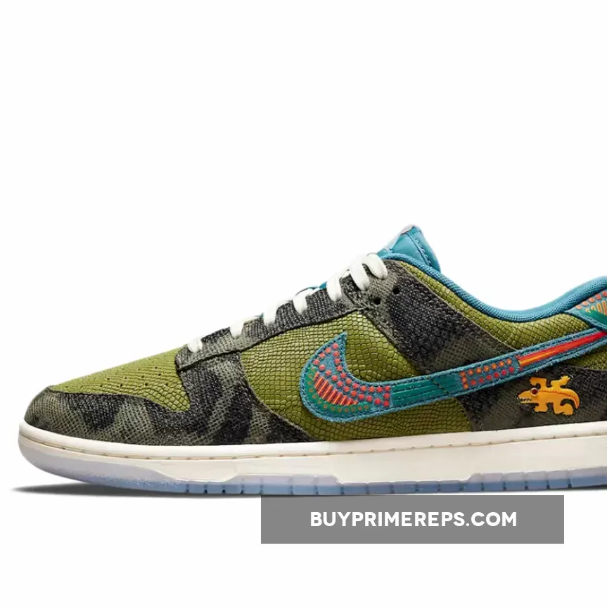 The upper of the Nike Dunk Low “Siempre Familia” features a reptilian design, with a green faux lizard skin texture that immediately catches the eye. The overlays are dressed in a black faux snakeskin pattern, adding depth and contrast to the overall look of the shoe. The combination of these textures creates a visually striking and dynamic appearance.