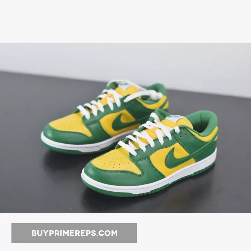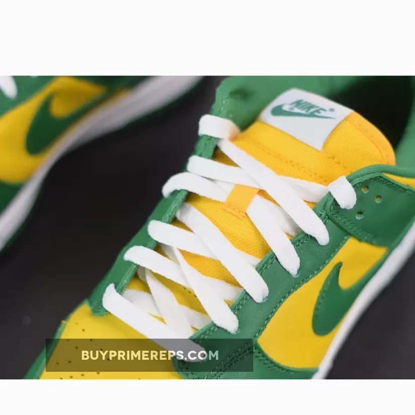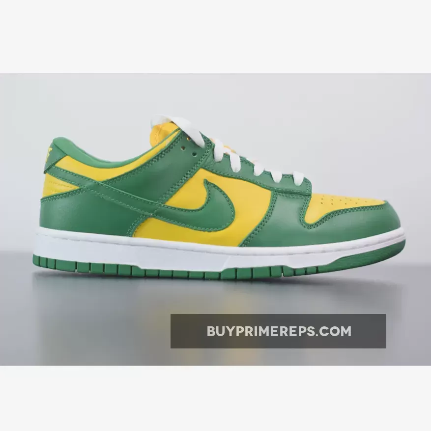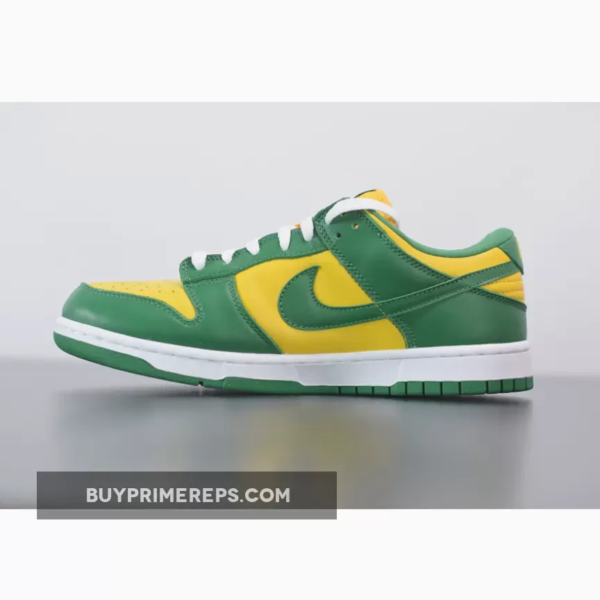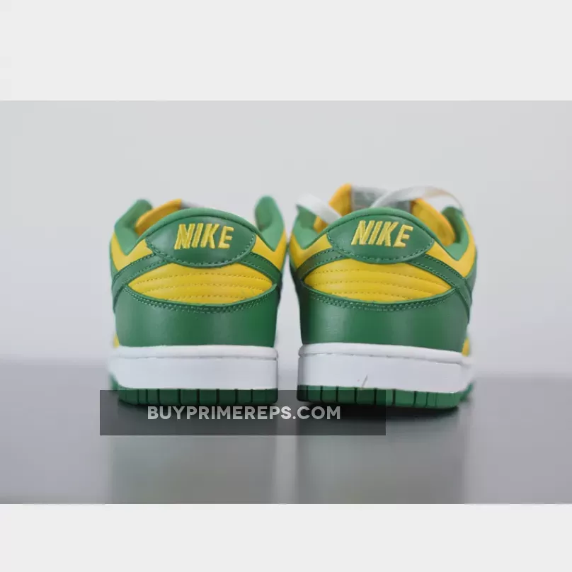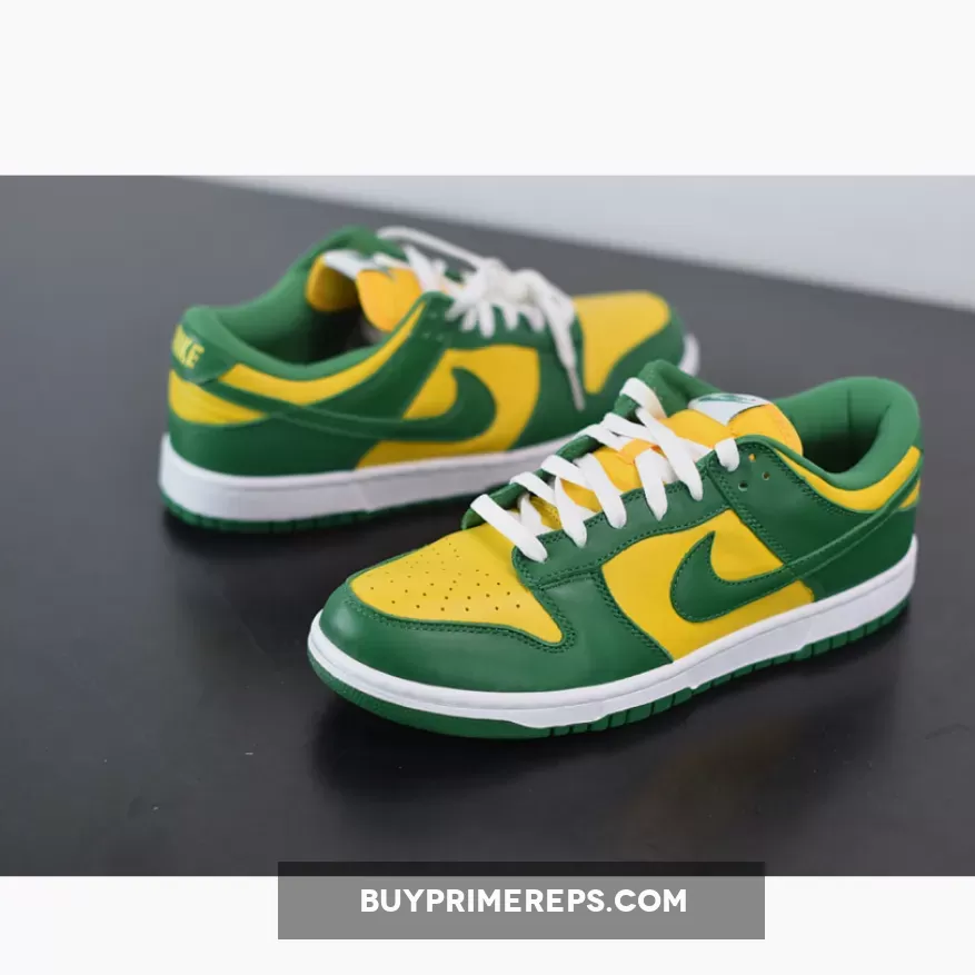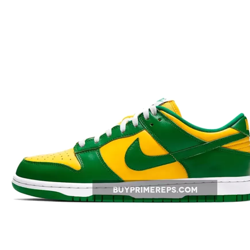 The upper of the Nike Dunk Low SP Brazil is constructed from premium leather, providing a luxurious look and feel. The color blocking draws inspiration from the vibrant green and yellow of Brazil, creating a visually striking design. The classic Nike Swoosh logos are prominently featured on both the lateral and medial sides, while additional branding can be found on the tongue and heel.