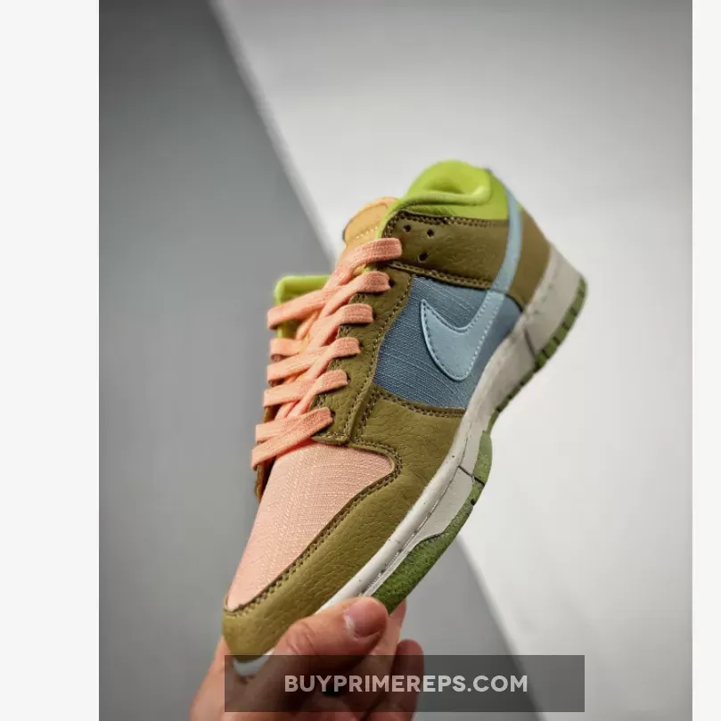 The upper of the Nike Dunk Low Nike Sun Club is constructed with canvas material, offering a unique texture and a sustainable touch. The toe box is adorned with a cool blush tone, while the side panels display a deeper salmon-pink shade on the lateral side and a refreshing sea blue hue on the medial face. Moving towards the back, a vibrant lime green color dominates the heel, adding a pop of brightness to the overall design.