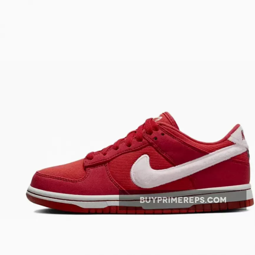 Nike is set to release a special Valentine’s Day edition of the beloved Dunk Low silhouette. This kids-exclusive sneaker features a vibrant color scheme of Fire Red, Pink Foam, Light Crimson, White, and Team Red. What sets this shoe apart is the use of mixed materials, including corduroy, suede, mesh, and a fleece-like textile for the Swoosh logos and heel tabs.