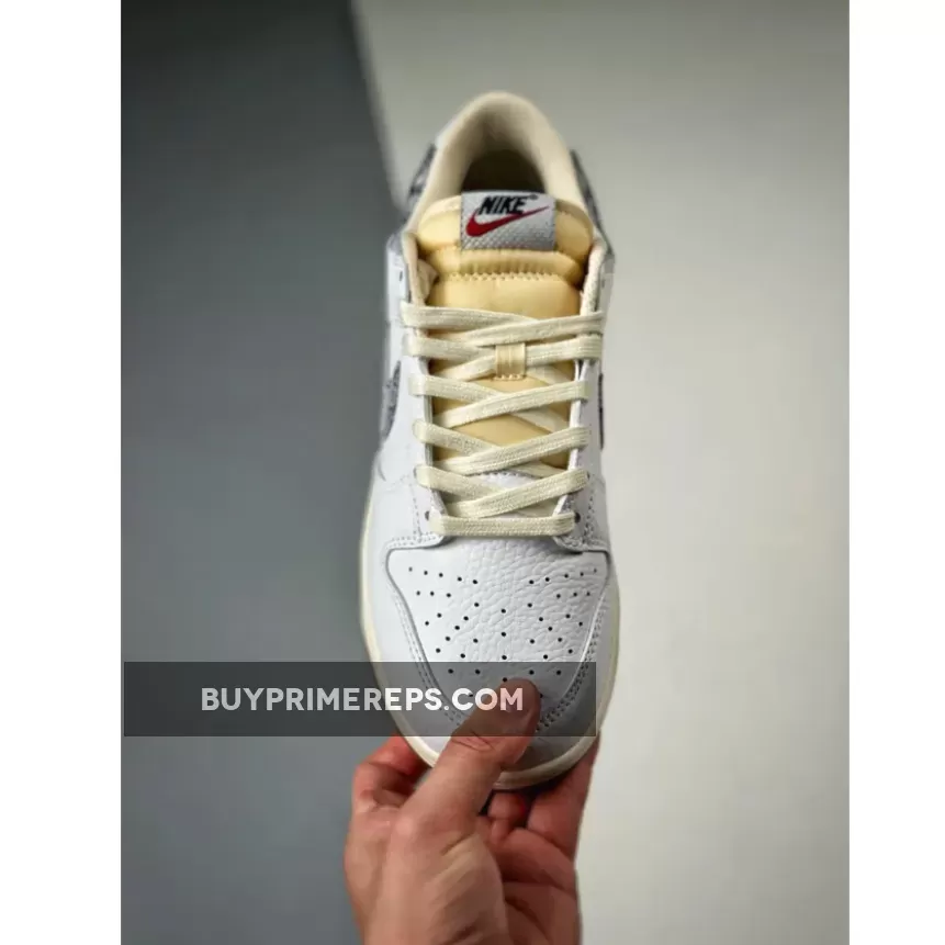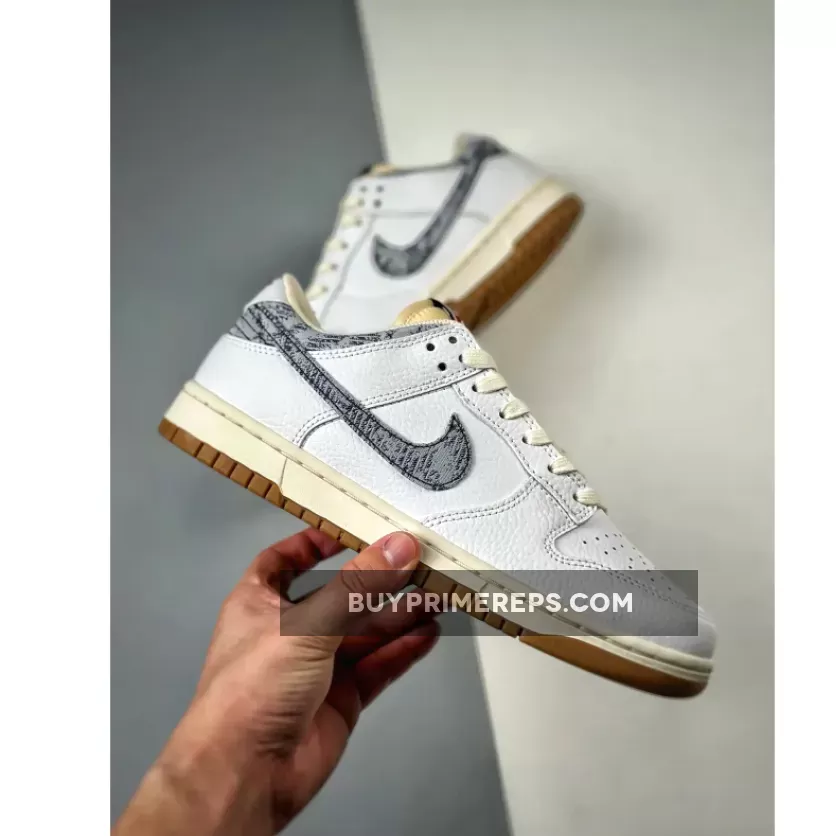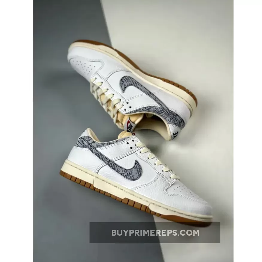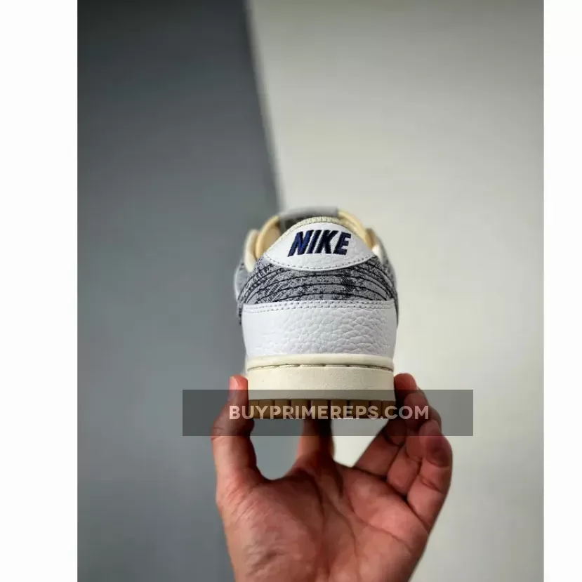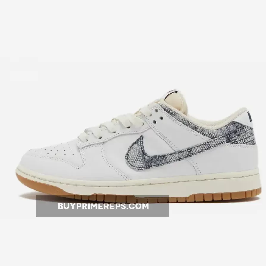 The latest iteration of the Nike Dunk Low is the “Washed Denim” version, which features a retro treatment. The shoe is predominantly white, with a tumbled leather upper that adds a premium touch. The tongues are made of beige-toned nylon, matching the mesh sock liners for added breathability.