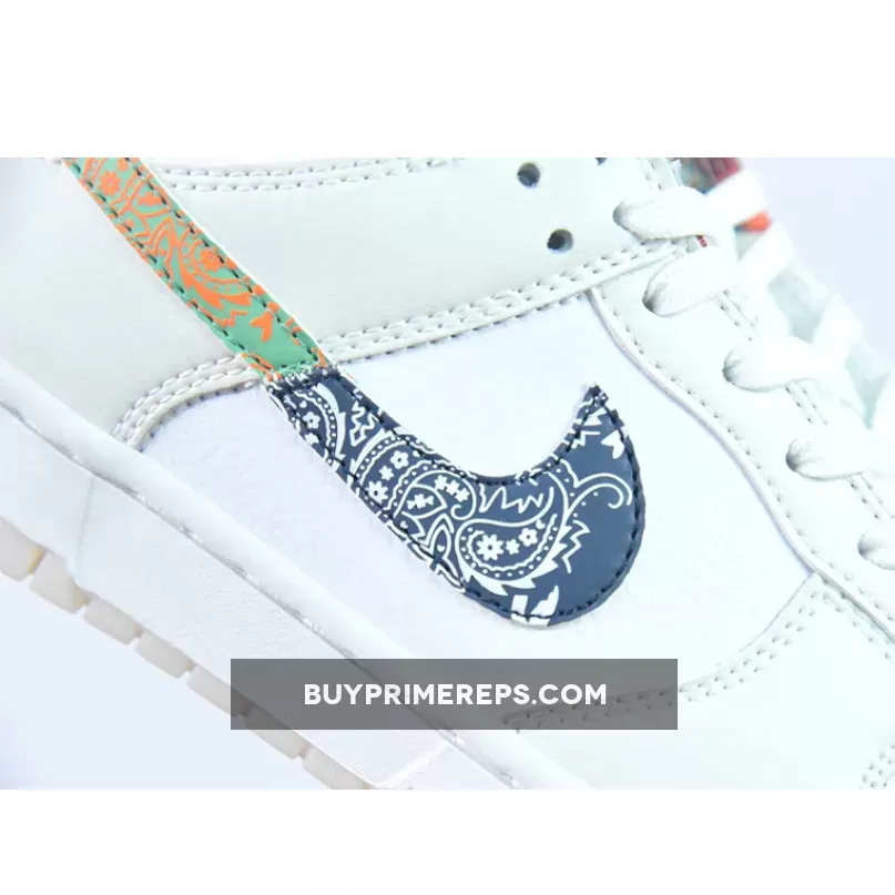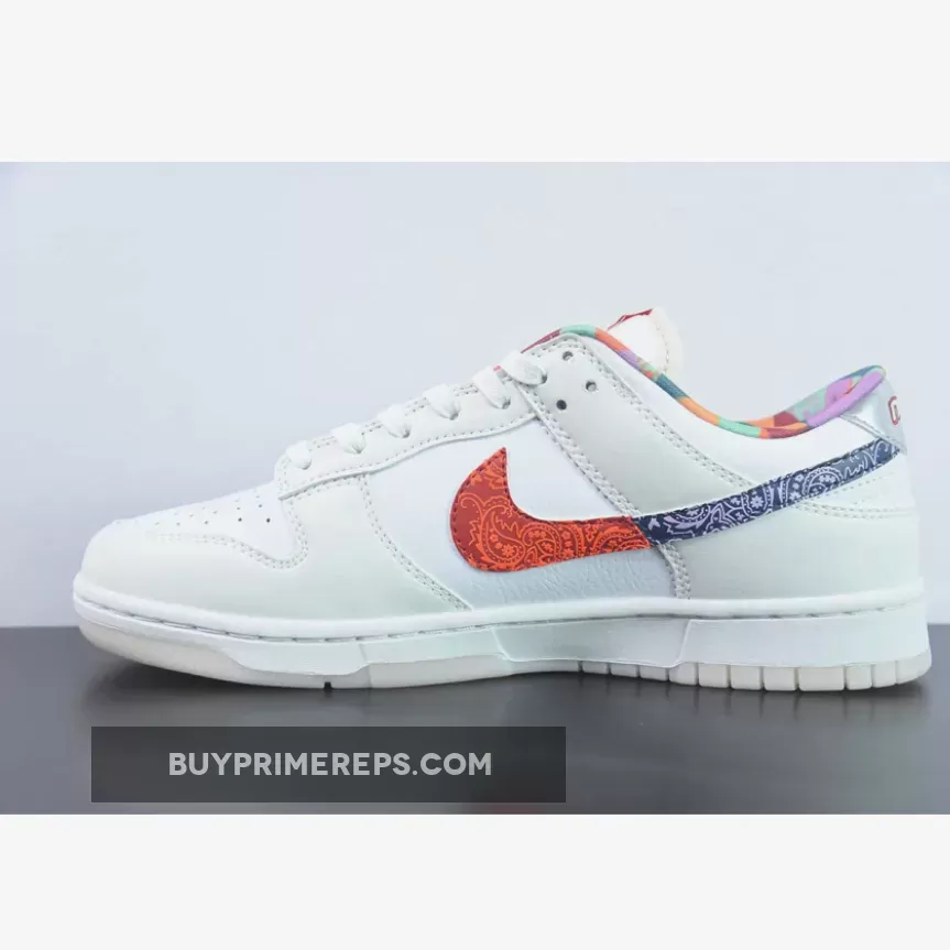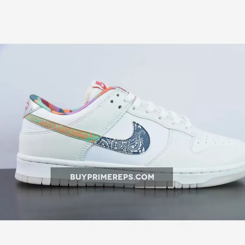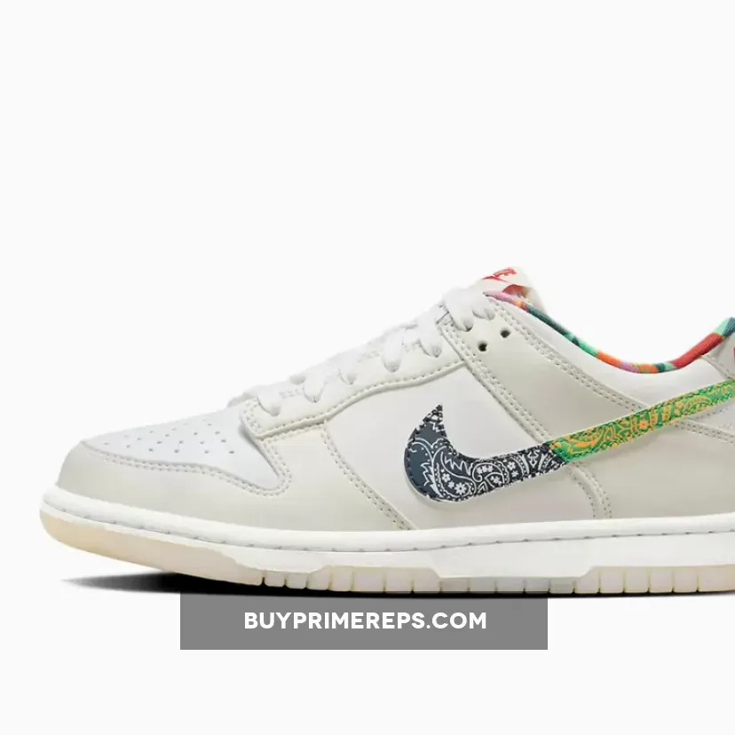 Introducing the Nike Dunk Low GS “Paisley Multi,” a basketball sneaker designed by Peter Moore with a fresh and boho-inspired aesthetic. This smaller-sized, low-top Dunk is crafted from full leather and features a unique and eye-catching design. The signature profile Swooshes on both the medial and lateral side walls showcase mismatched multi-colored paisley prints, adding a playful and vibrant touch to the shoe.