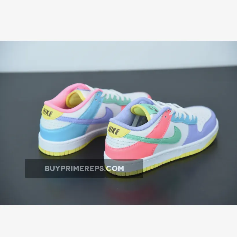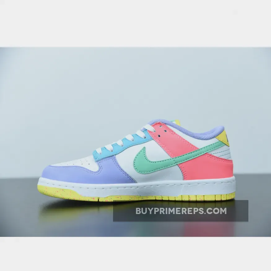 The Dunk Low SE Easter features a mismatched colorway, with soft shades of pink, purple, green, and yellow adorning the overlays, Swooshes, tongue labels, heels, and inner lining. The combination of these pastel tones creates a beautiful and harmonious palette that is both fun and versatile. The white midsole adds a clean and crisp touch, while the yellow speckled rubber outsole provides an unexpected pop of color and traction.