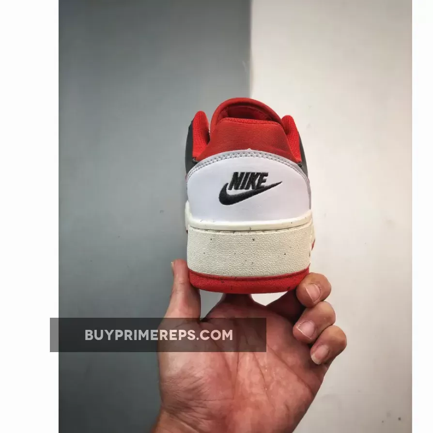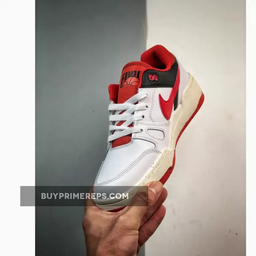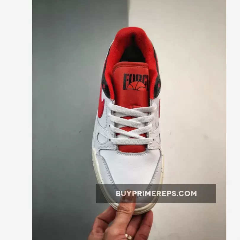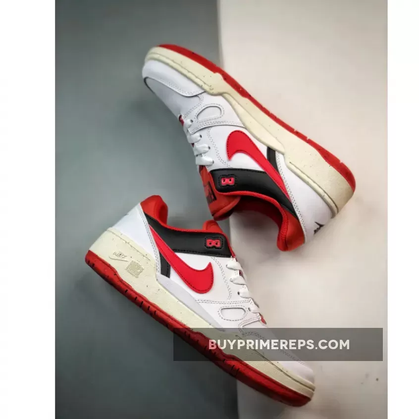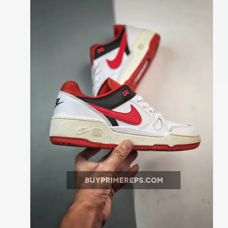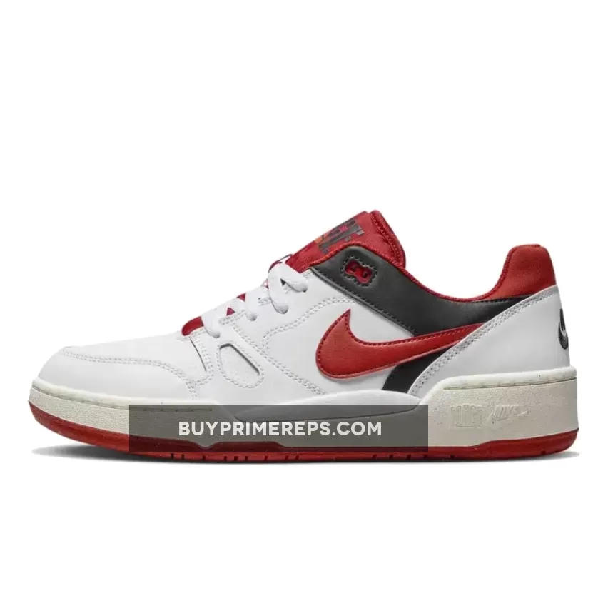 In terms of color scheme, the Nike Full Force Low boasts a crisp white base with vibrant red accents. The Swooshes, tongues, lining, and rubber outsole all feature pops of red that add a bold and eye-catching element to the shoe. Black overlays, insoles, and “Nike” embroidered heels provide a contrasting touch, giving the shoe a sleek and edgy look.