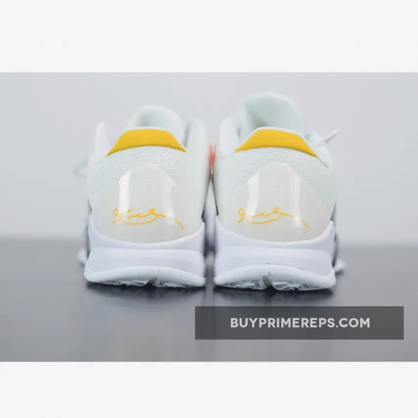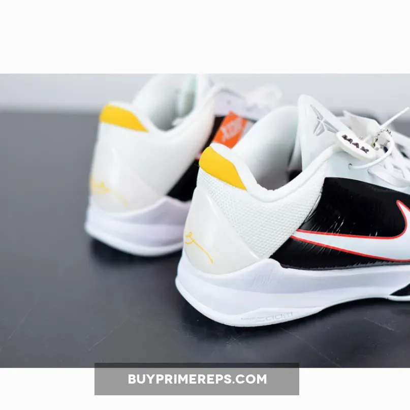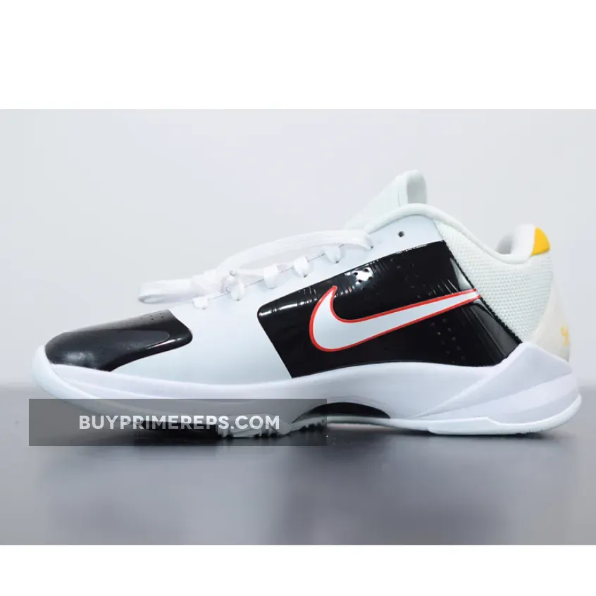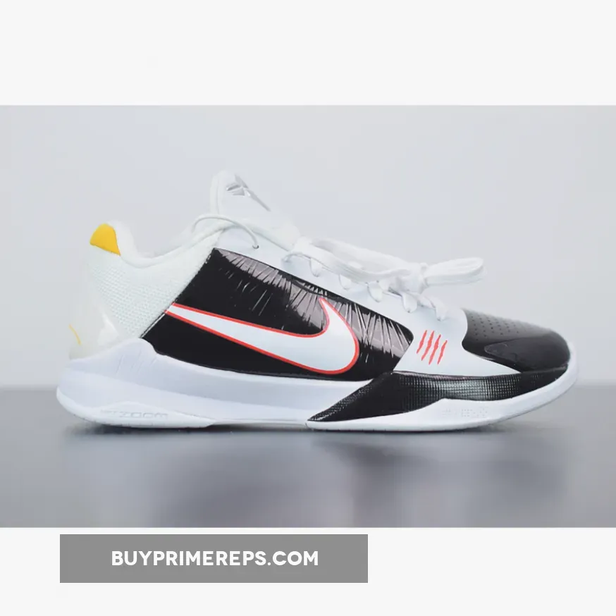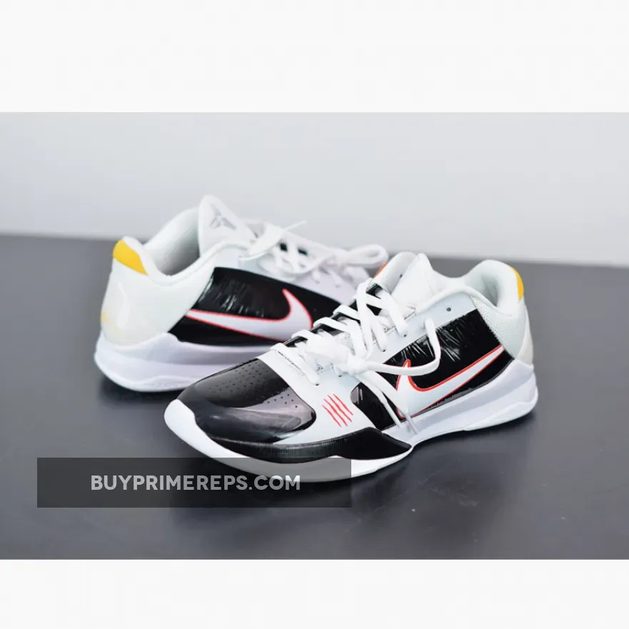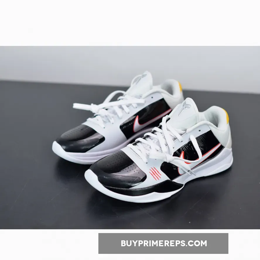 The color scheme of the Nike Zoom Kobe 5 Protro ‘Alternate Bruce Lee’ is a combination of black and white, reminiscent of Lee’s jumpsuit in the film. The black and white upper is highlighted by yellow accents, adding a vibrant touch to the design. These yellow accents pay tribute to the original Bruce Lee colorway released in 2010.
