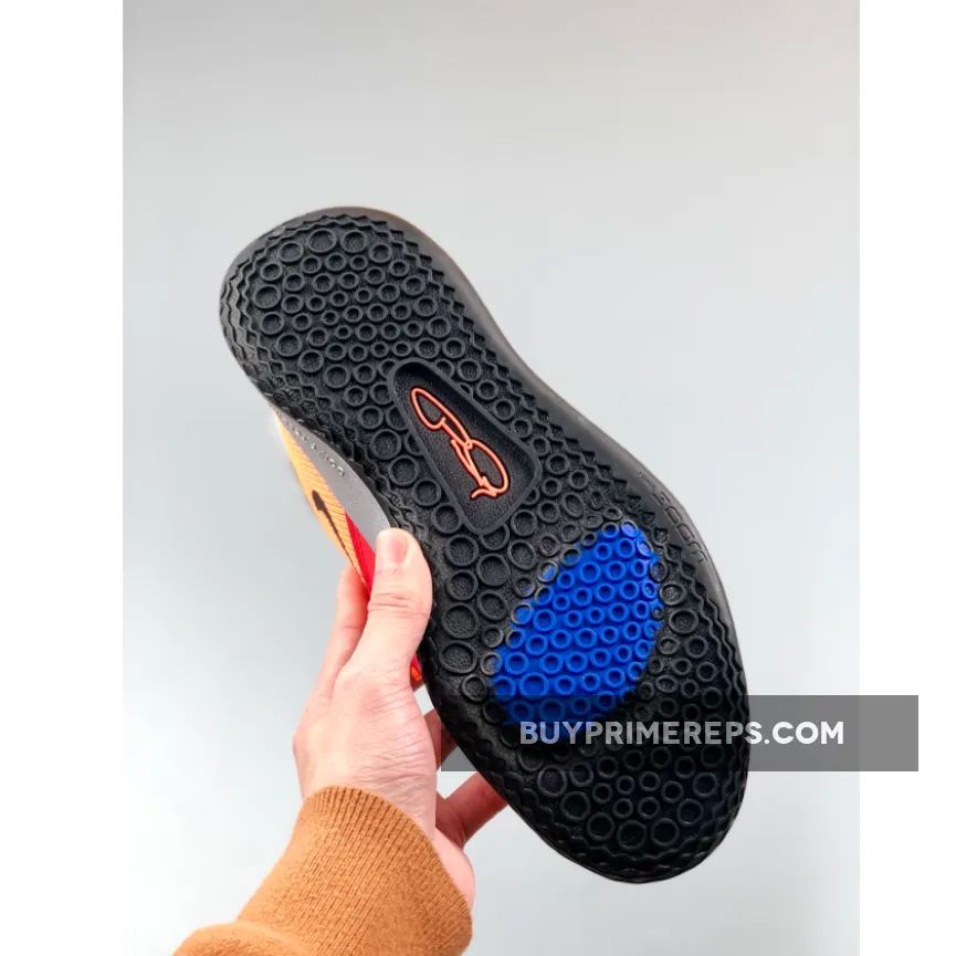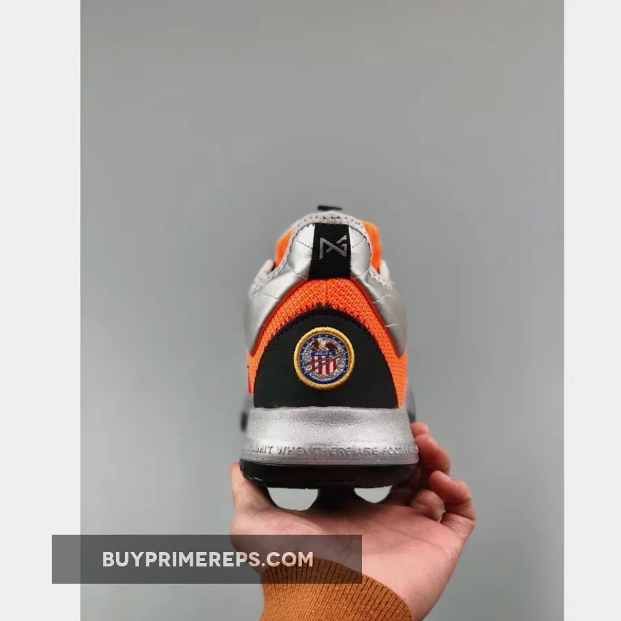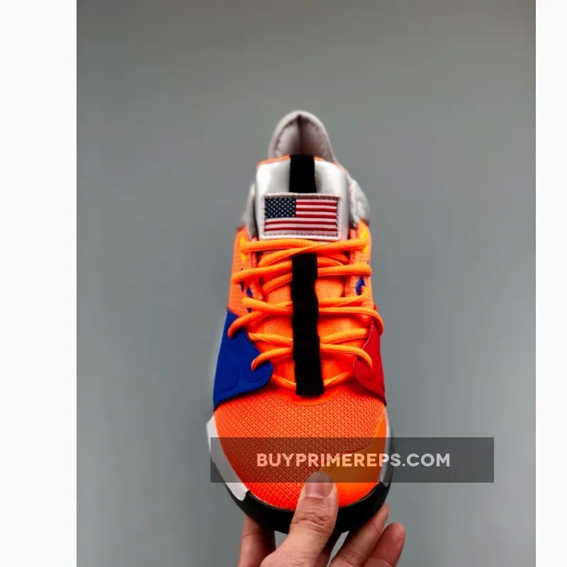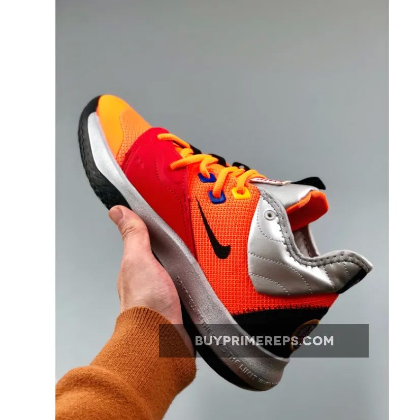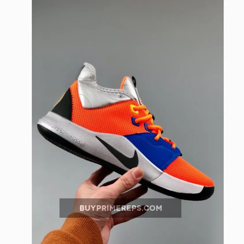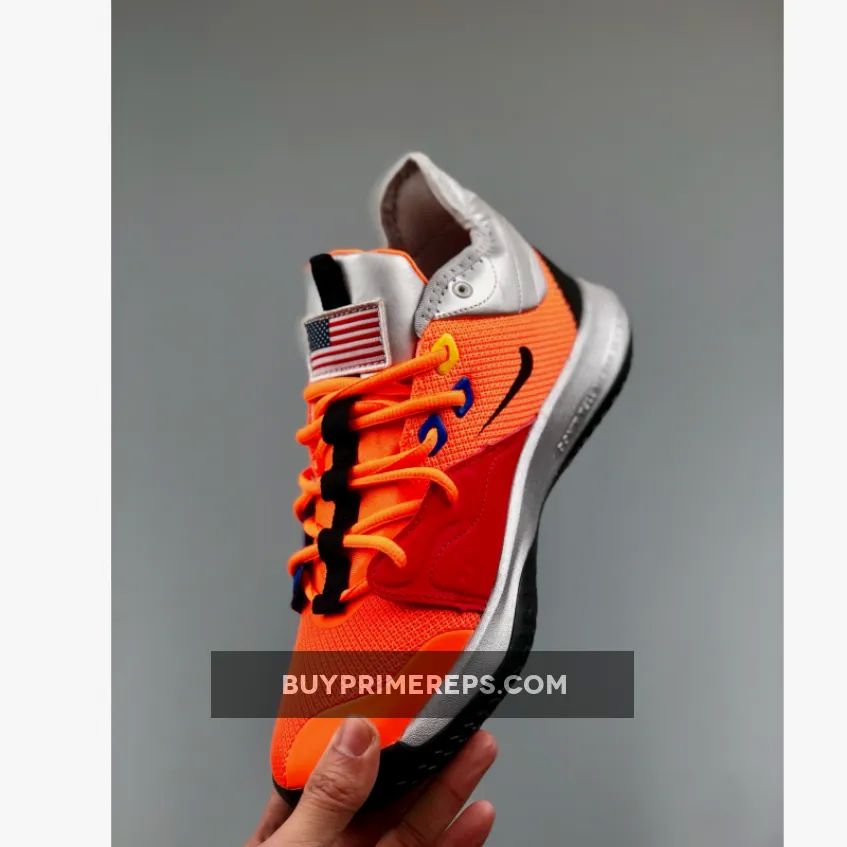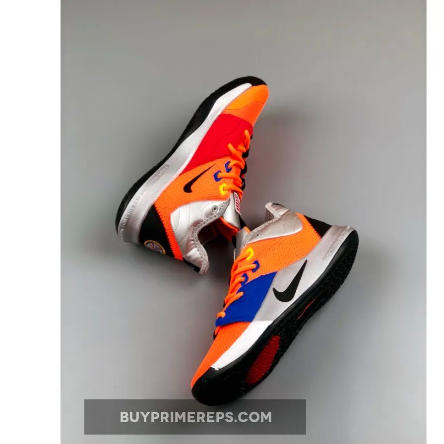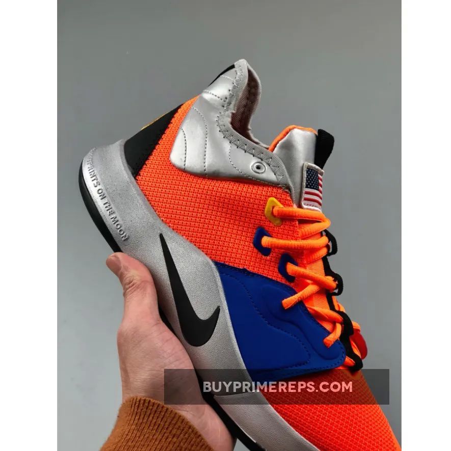 The Nike PG 3 “NASA” features a breathable mesh upper in a striking shade of orange, giving it a futuristic and space-like appearance. The forefoot is adorned with mismatched overlays in red and blue, adding a unique touch to the design. Metallic silver details can be seen on the collar and sole, further enhancing the space exploration theme.
