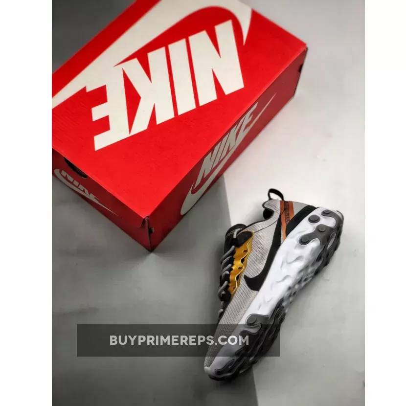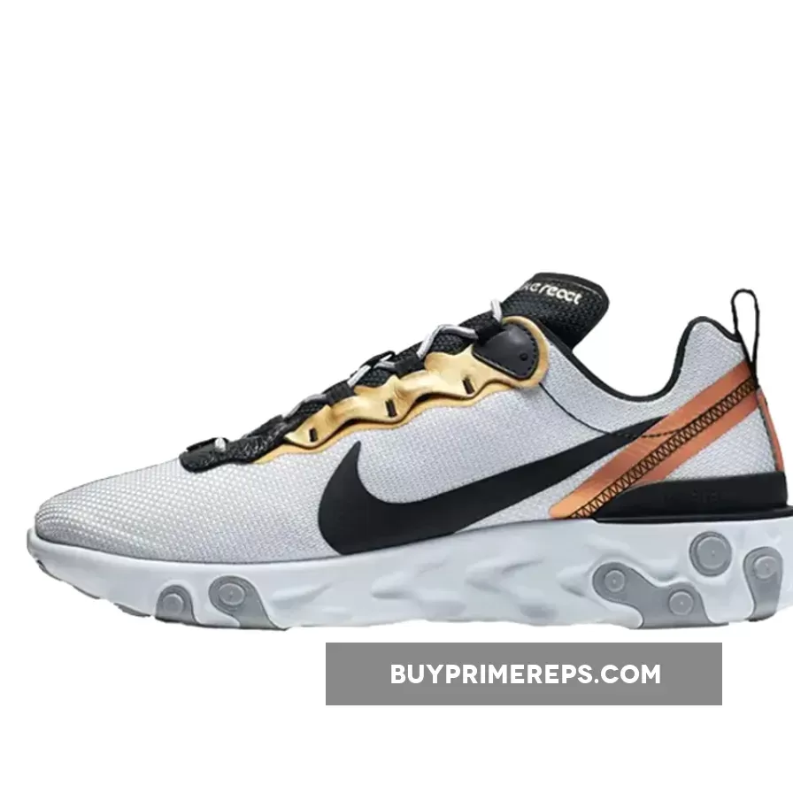 Introducing the Nike React Element 55 Gold Grey CD7627-001, a premium sneaker that combines style, comfort, and luxury. This sleek shoe features a predominantly white upper with gold accents that add a touch of opulence to the overall design. The gold accents can be found on the lacing system, heel, tongue, and insole, giving the shoe a dash of elegance.