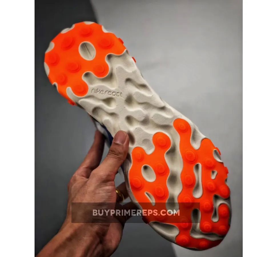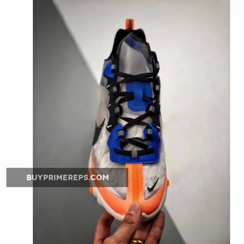 The upper of the React Element 87 Blue Orange is constructed with a semi-translucent beige material, reminiscent of the Nike Zoom Fly. The black low slung Swoosh stands out against the neutral backdrop, adding a touch of contrast. The heel features exterior taping and the lacing system is wavy and trail-style, giving the shoe a unique and dynamic look. Premium materials such as suede and leather are used in the construction, along with reflective accents for added visual interest. The tongue of the shoe is designed with jagged edges, adding to its futuristic aesthetic.
