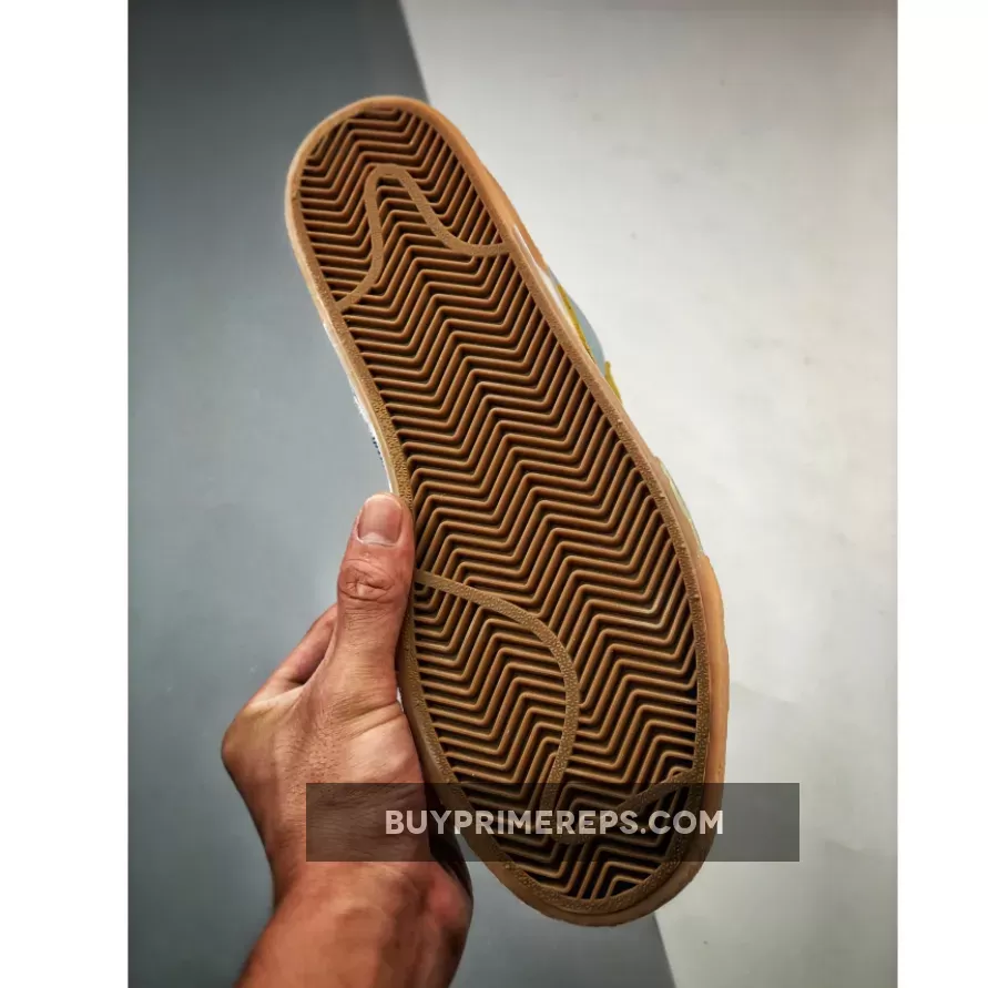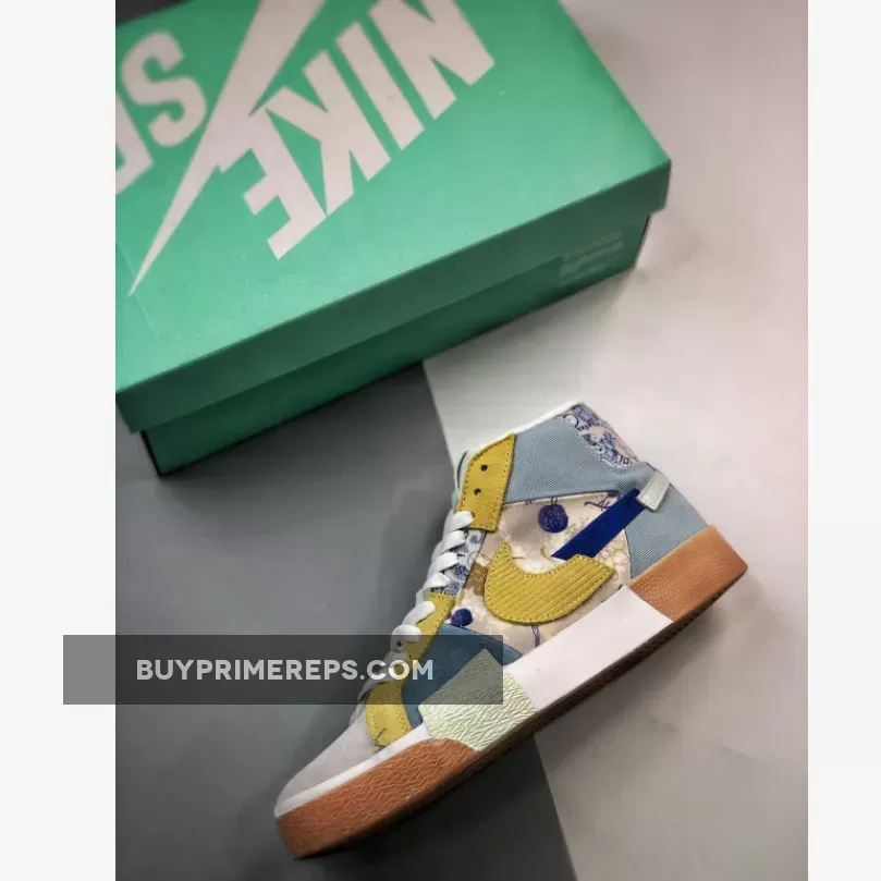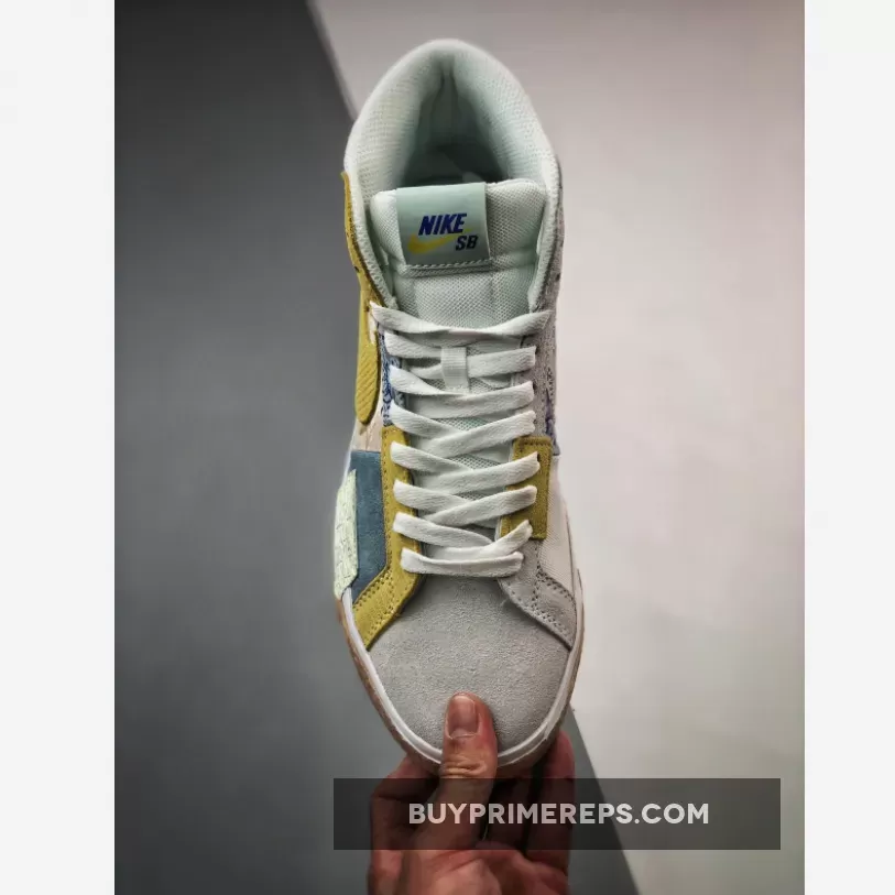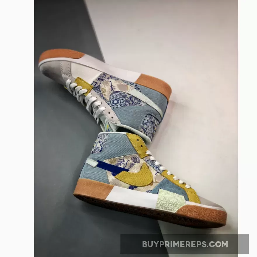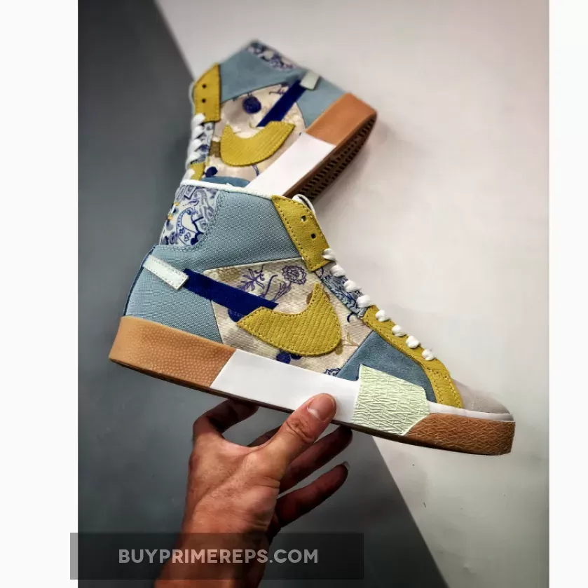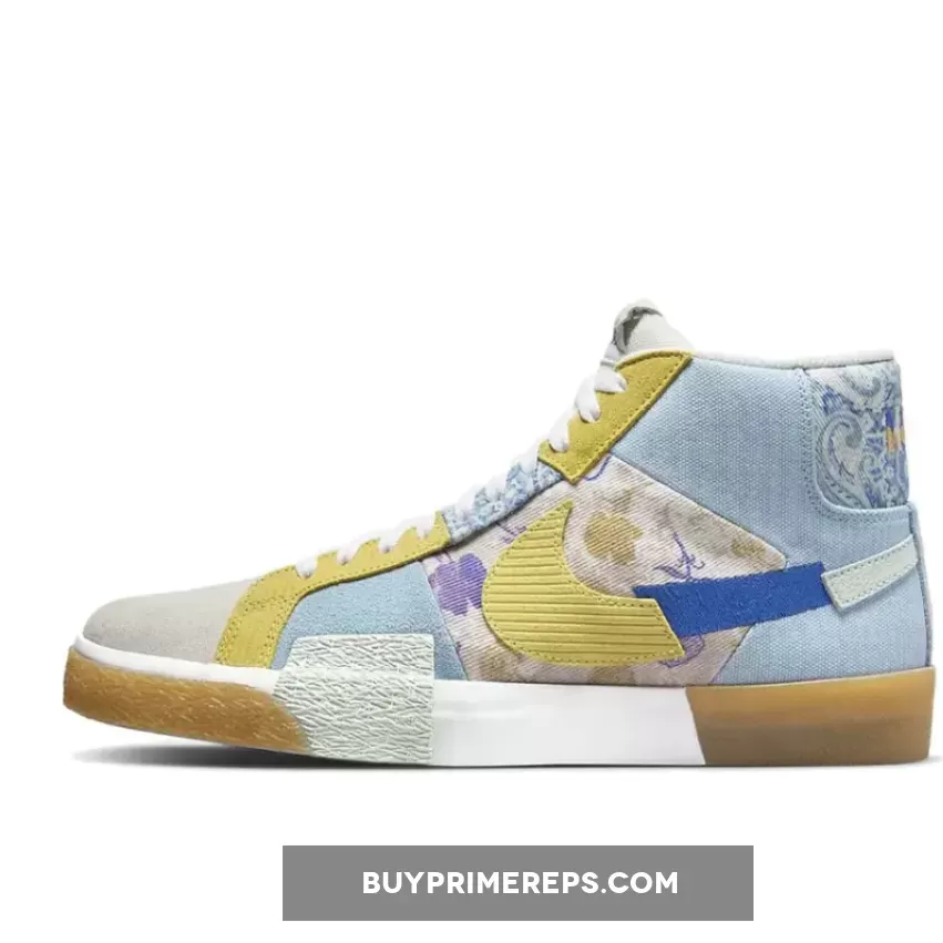 The color palette of the Nike SB Zoom Blazer Mid Premium Paisley Boarder Blue is dominated by pastel shades of blue and yellow, creating a refreshing and spring-like aesthetic. The soft hues are complemented by a white midsole and a gum outsole, adding a touch of contrast and completing the overall design.