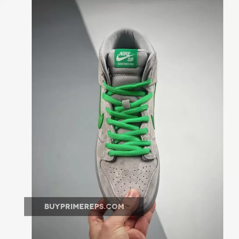 The upper of the Nike SB Dunk High Silver Box is constructed with a premium grey suede material, giving the shoe a luxurious and sophisticated feel. The grey colorway is reminiscent of the silver box, providing a seamless connection between the shoe and its inspiration. Green accents can be found on the laces and the iconic Nike Swoosh logos, adding a pop of color and creating a striking contrast against the grey suede.