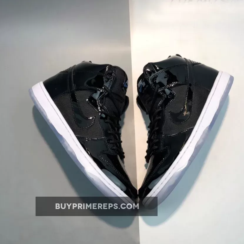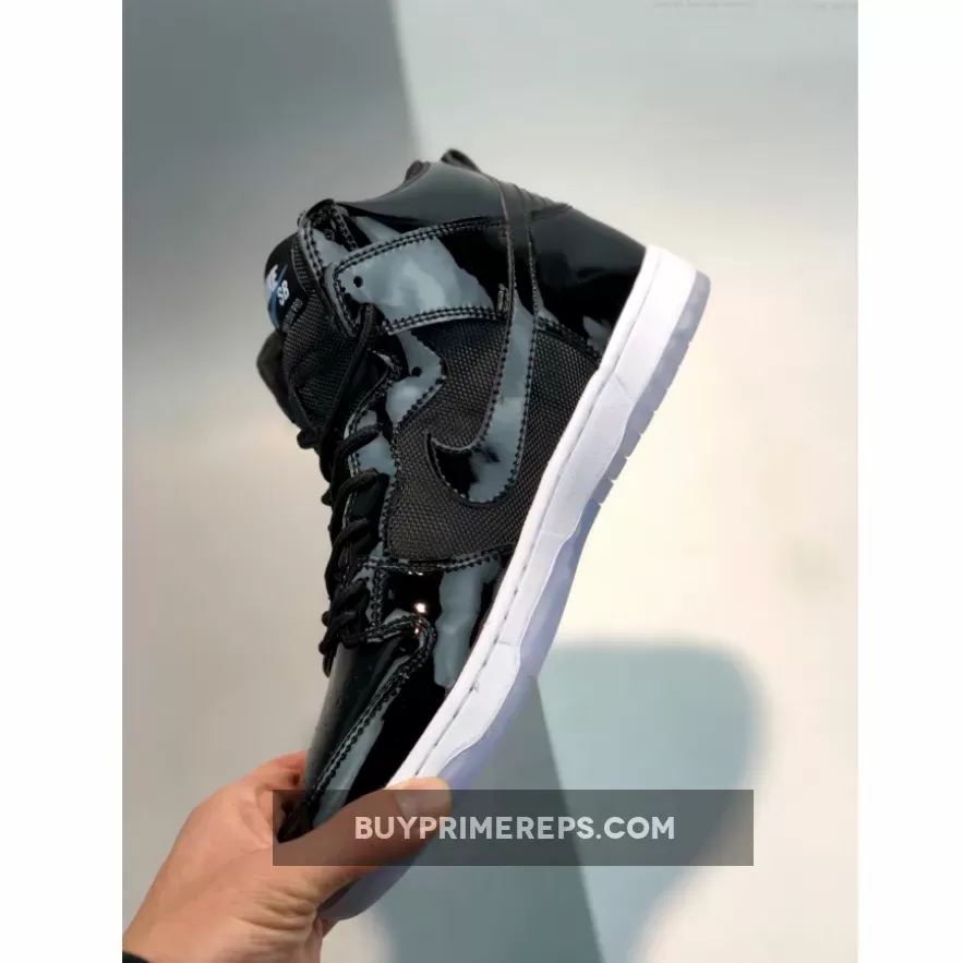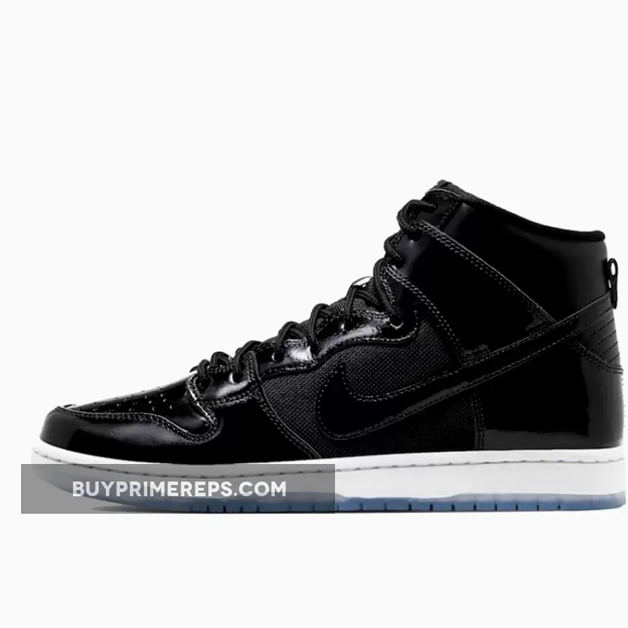 The upper of the Dunk High SB PRM ‘Space Jam’ is made from a shiny black patent leather, giving it a premium and luxurious look. The quarter panel features ballistic mesh, adding a touch of texture to the shoe. The collar is made from full-grain leather, providing comfort and support.