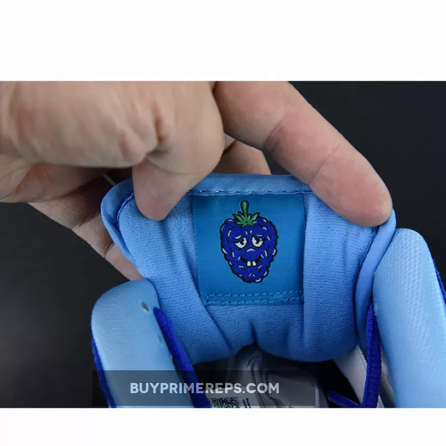 Adding to the fruity theme, the mesh tongue is presented in University Blue and showcases Nike SB Dunk branding on the tongue tab. But what truly sets this sneaker apart is the playful fruit embroidery on the inner lining. An illustration of a stoned Blue Raspberry with two different facial expressions appears behind the tongue tags, injecting a touch of whimsy into the design.