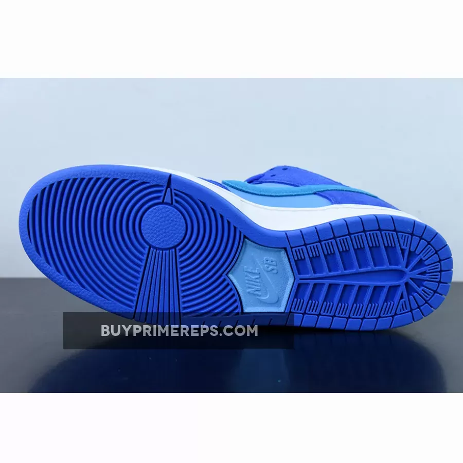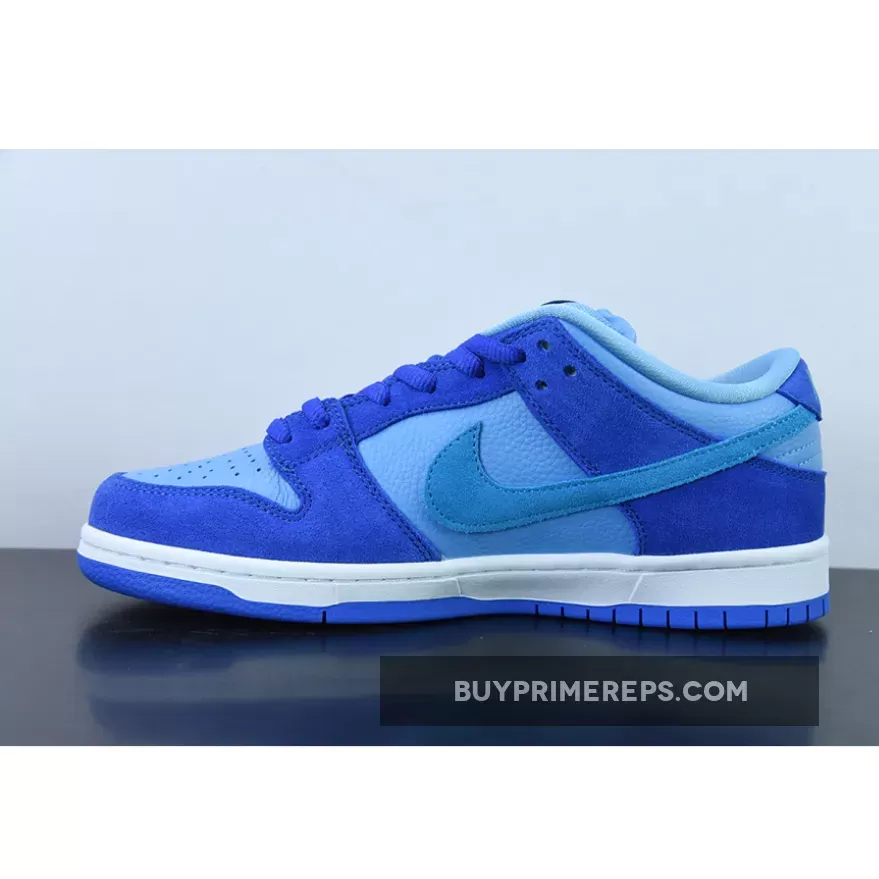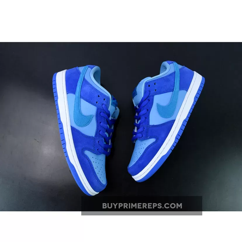 The Nike SB Dunk Low Fruity Pack Blue Raspberry sits atop a clean white midsole, providing a crisp contrast to the vibrant blue upper. Completing the look is a rubber outsole in Racer Blue, tying the color palette together seamlessly.