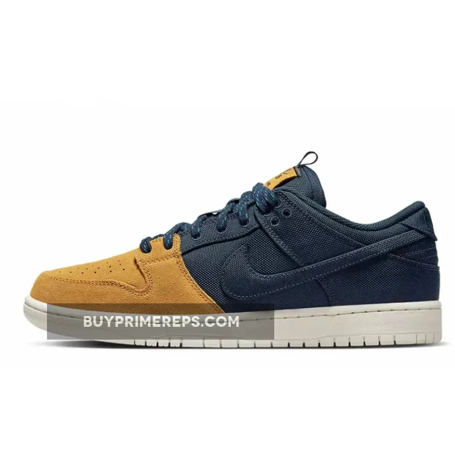 Nike SB Dunk Low Midnight Navy Desert Ochre is the latest addition to Nike’s lineup of skateboarding sneakers. This unique colorway combines Midnight Navy, Desert Ochre, Sail, Green Abyss, and Black, creating a striking and eye-catching design.