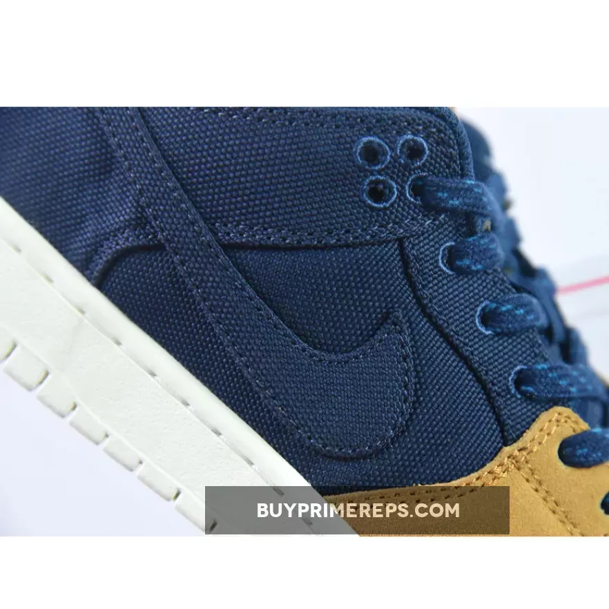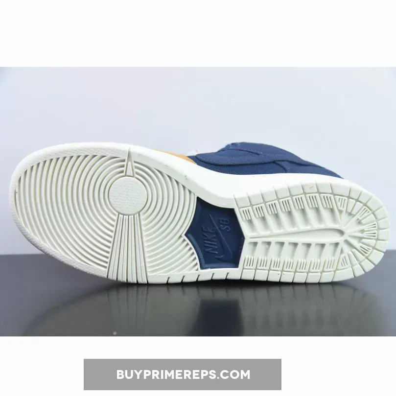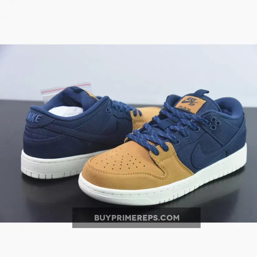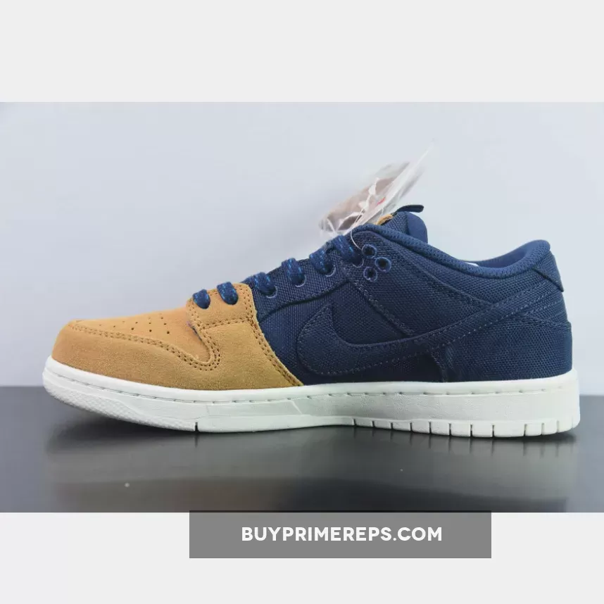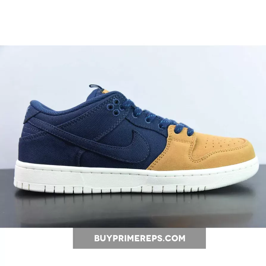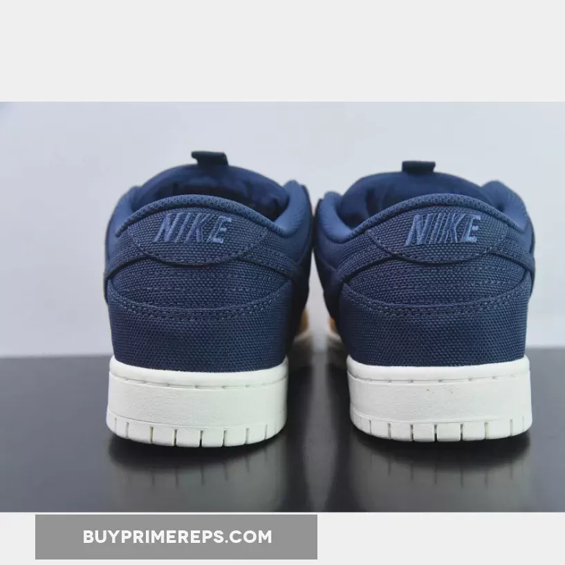 The upper of the Nike SB Dunk Low features a split construction, with the toe box and toe cap made from Desert Ochre suede, while the mid-panels up to the toe panels are crafted from Midnight Navy canvas. This two-tone design adds a visually interesting element to the shoe, setting it apart from other SB Dunk Low models.