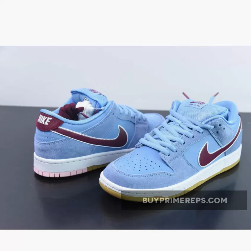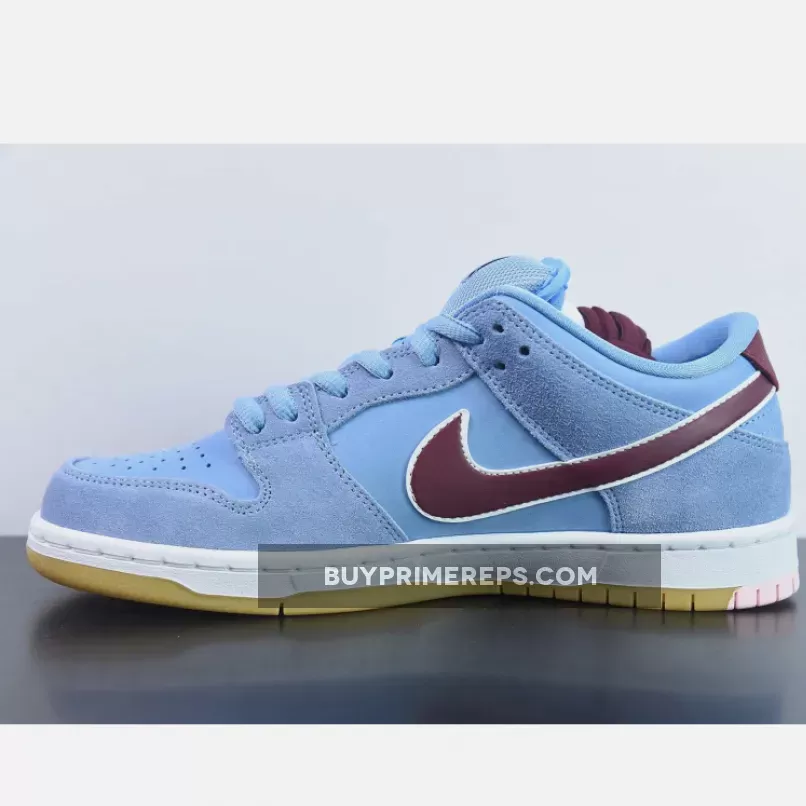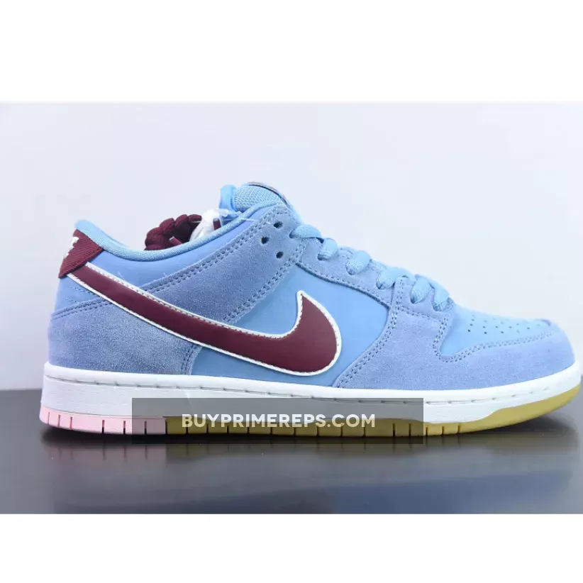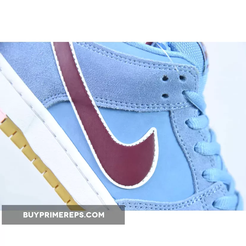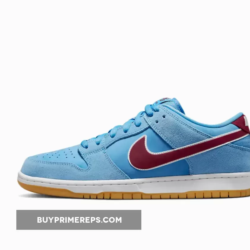 The Nike SB Dunk Low Phillies is a highly anticipated sneaker that pays homage to the famous baseball team, the Philadelphia Phillies. Part of the “Bubble Gum” Pack, this sneaker features a vibrant University Blue suede upper, reminiscent of the team’s iconic colors. The shoe is further accentuated by Team Red Swooshes on the side panels, outlined with white detailing for a striking contrast.