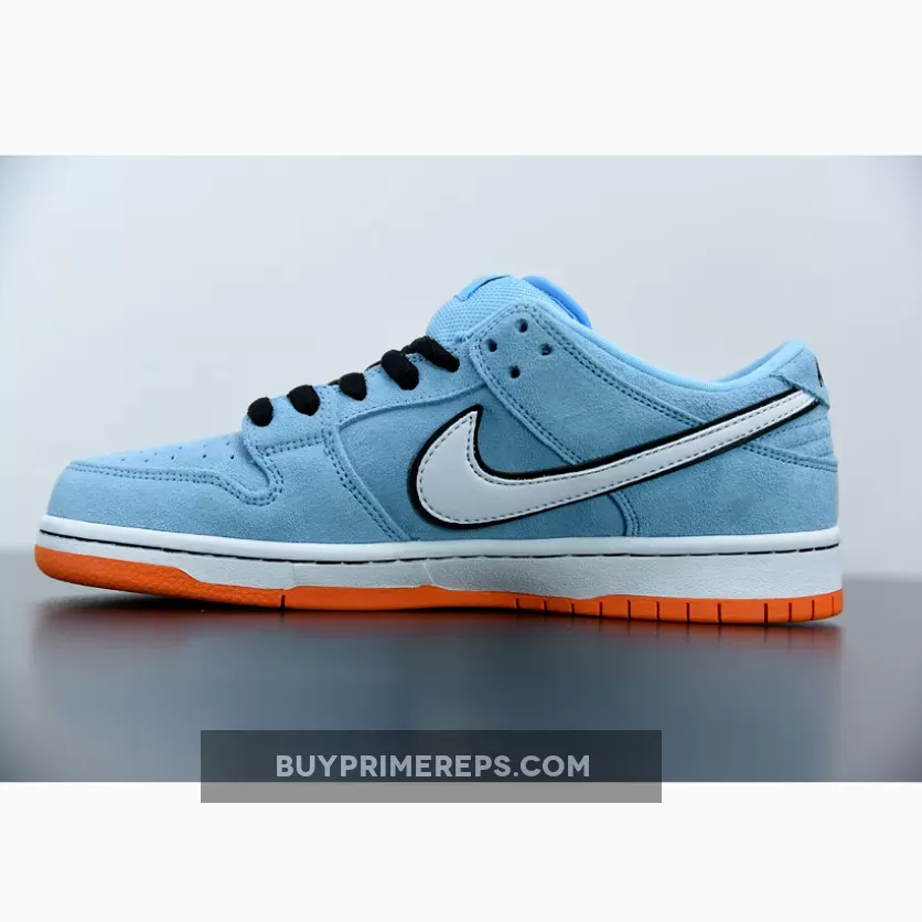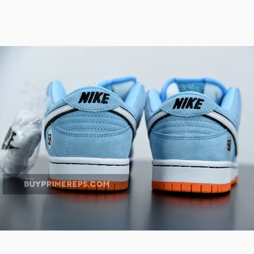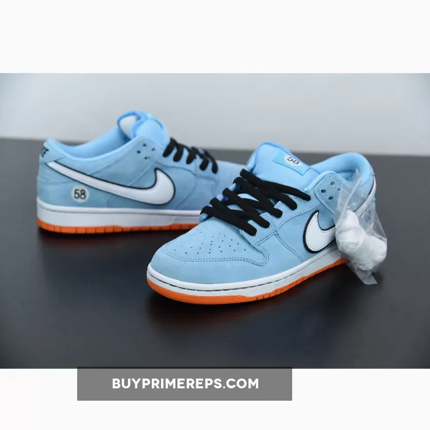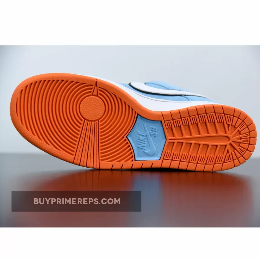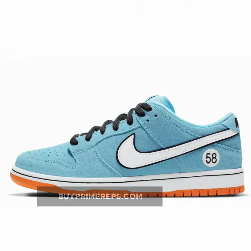 Continuing the retro car theme, the outsole of the shoe is a vibrant orange color, reminiscent of the bold and energetic racing stripes seen on the GT40. This durable rubber outsole not only provides excellent traction but also adds a pop of color to the overall design. The black laces and classic Dunk touches, such as the perforated toe box, add further depth and detail to the shoe.