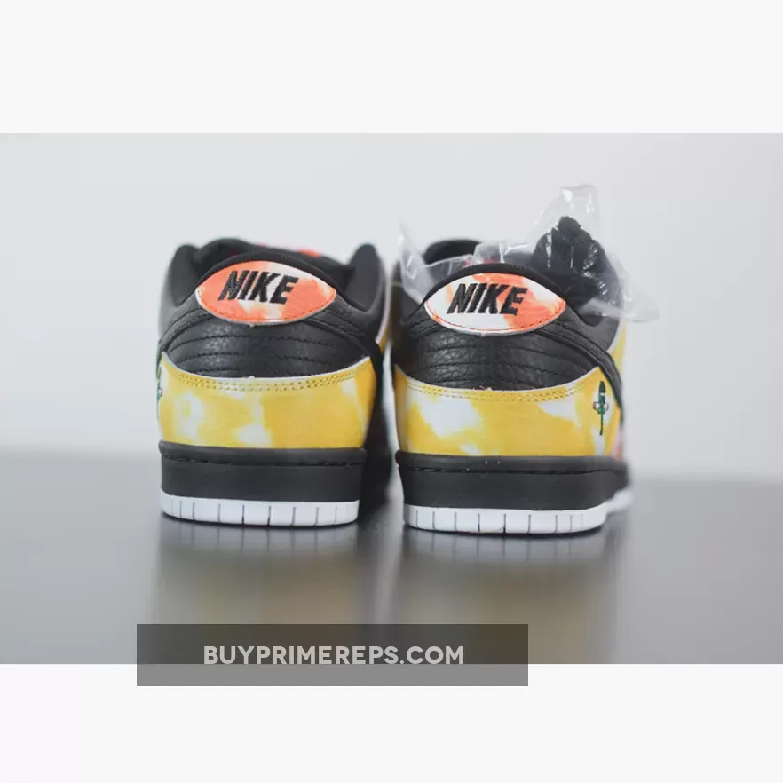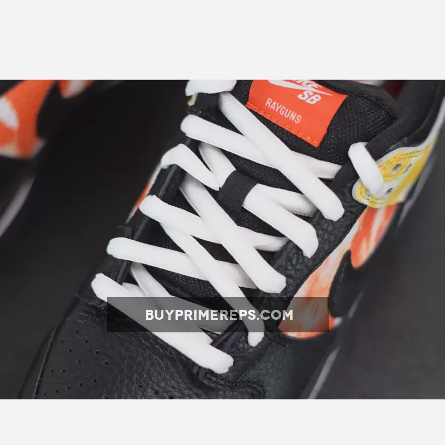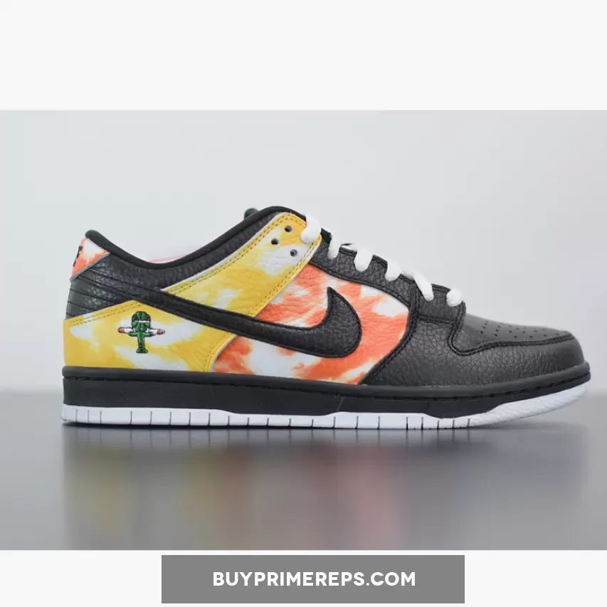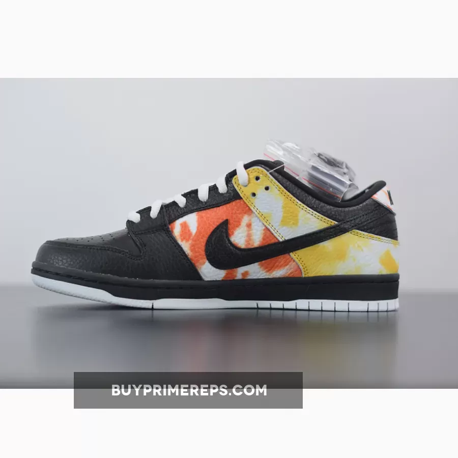 Introducing the Nike SB Dunk Low Raygun Tie Dye, a sneaker that pays homage to the heritage of the iconic Rayguns with a vibrant and eye-catching design. With its smooth black leather upper, this shoe combines classic style with a unique twist. The clean white laces add a fresh touch to the lace unit, creating a contrasting look against the black backdrop.