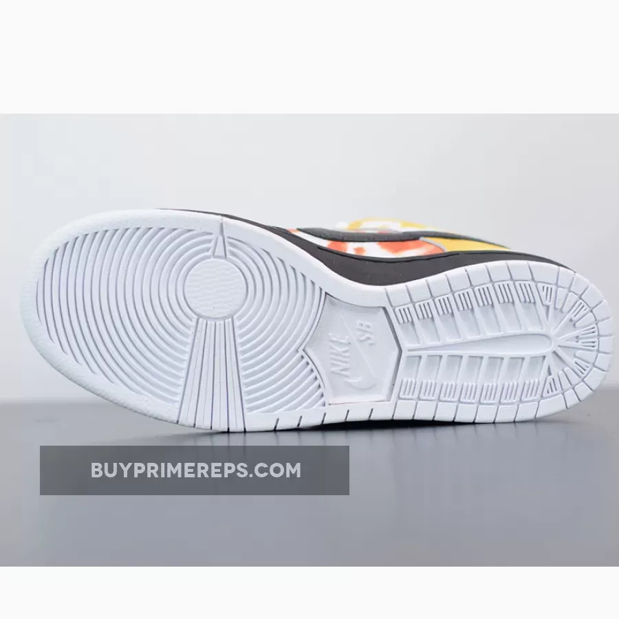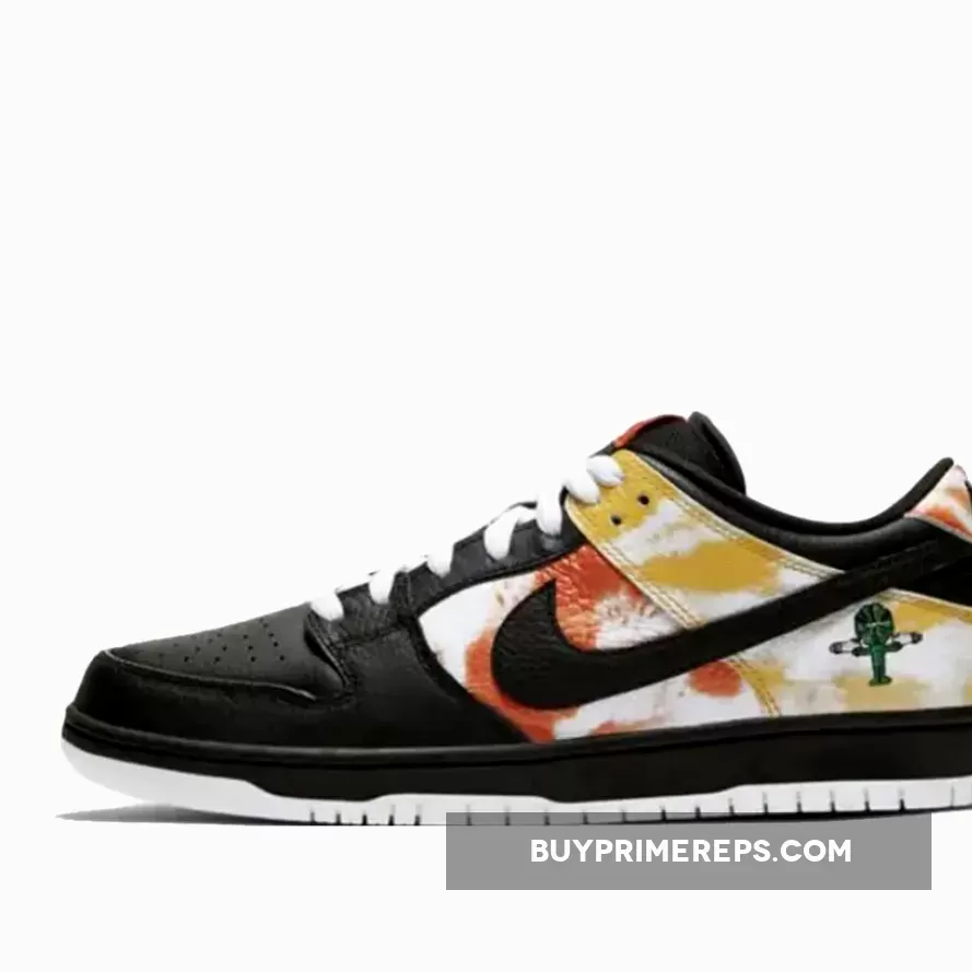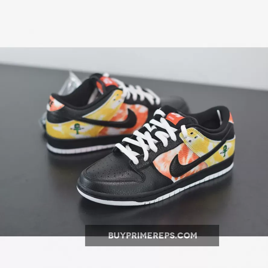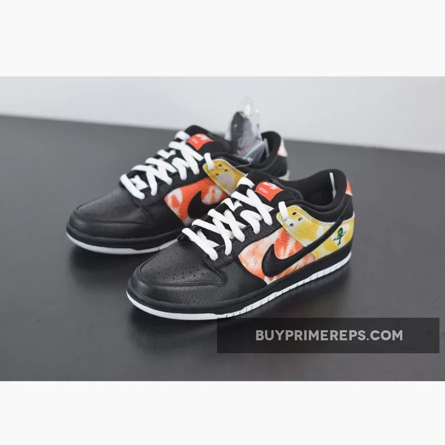 Introducing the Nike SB Dunk Low Raygun Tie Dye, a sneaker that pays homage to the heritage of the iconic Rayguns with a vibrant and eye-catching design. With its smooth black leather upper, this shoe combines classic style with a unique twist. The clean white laces add a fresh touch to the lace unit, creating a contrasting look against the black backdrop.