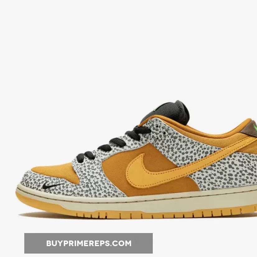 The upper of the Nike SB Dunk Low Safari Kumquat is constructed from a breathable synthetic material that allows air to circulate around the foot, keeping it cool and comfortable. The use of leather overlays adds a touch of luxury to the sneaker, with a spotted print that contrasts beautifully with the mustard yellow fabric. The attention to detail is evident in the neon green accents on the heel and tongue, adding a pop of color to the overall design.