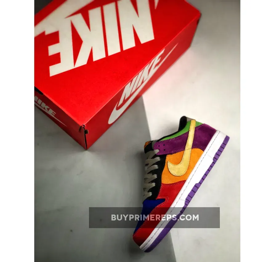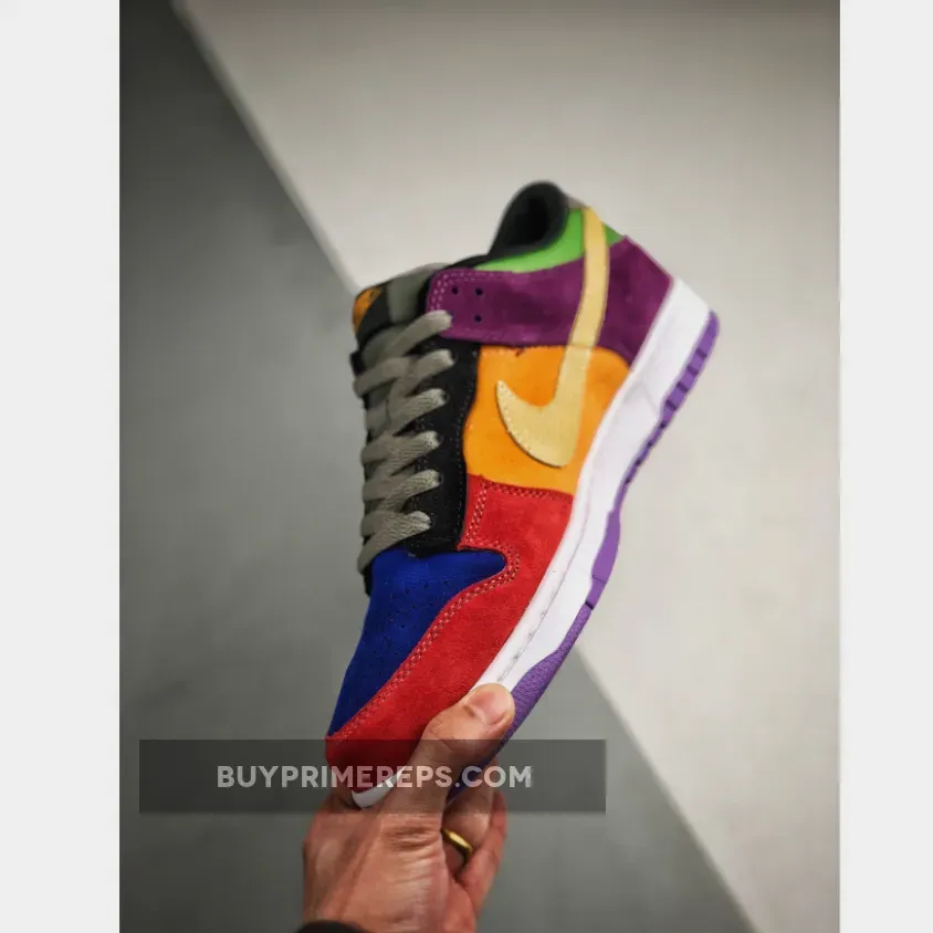 The upper of the Nike Dunk Low “Viotech 2019” features a variety of bold and eye-catching colors. The toe box is covered in a bright blue suede, while the forefoot is adorned with a striking red suede. The mid-panel showcases an energetic orange suede, while the heel is swathed in a rich purple suede. Completing the colorful palette, the collar is made of a vibrant green nylon material. This combination of colors creates a captivating and playful aesthetic.