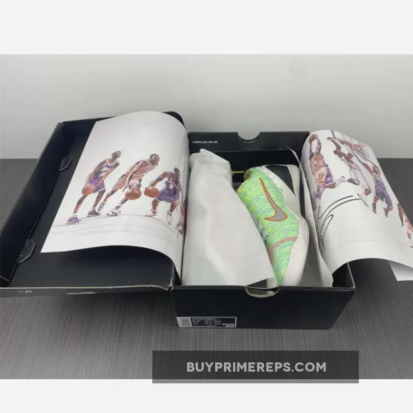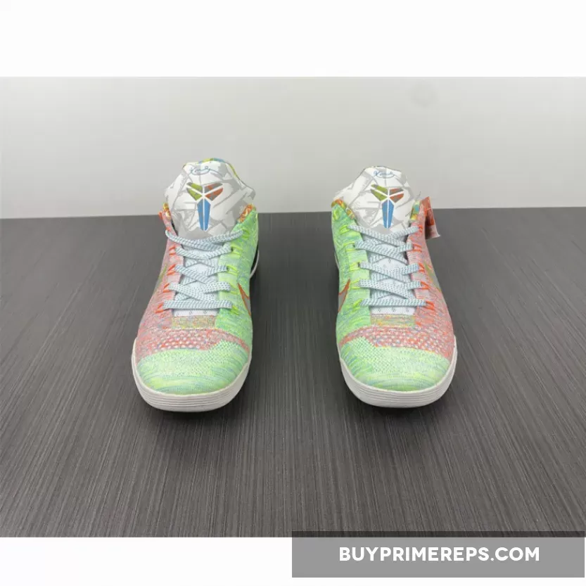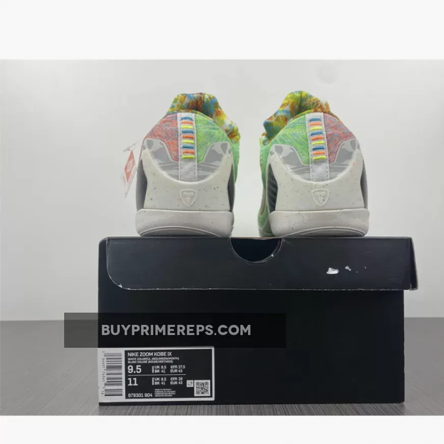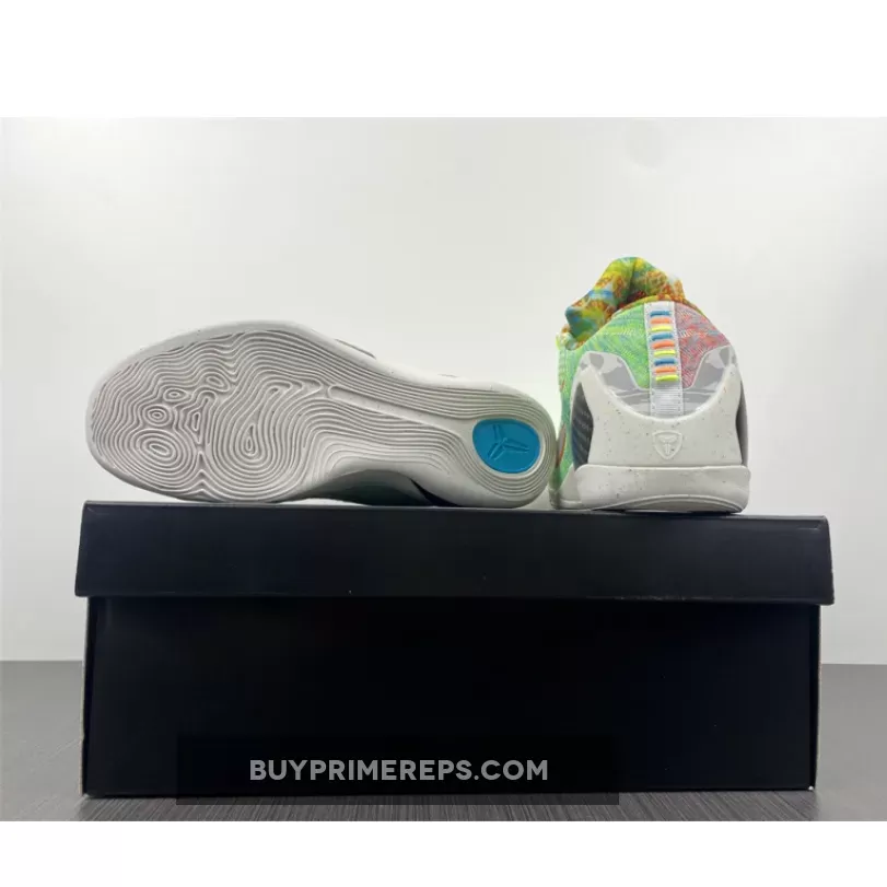 The upper of the Kobe 9 Elite What The is constructed with Nike’s innovative Flyknit technology, which provides a lightweight and flexible fit. The white base of the shoe allows the vibrant colors to truly pop, creating a visually striking design. The Flyknit upper is adorned with a newly designed multi-colored branding, showcasing the various colors used throughout the history of the Kobe line.