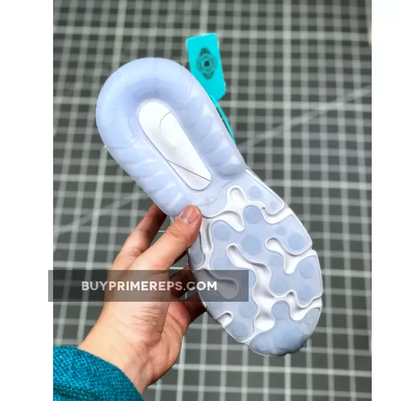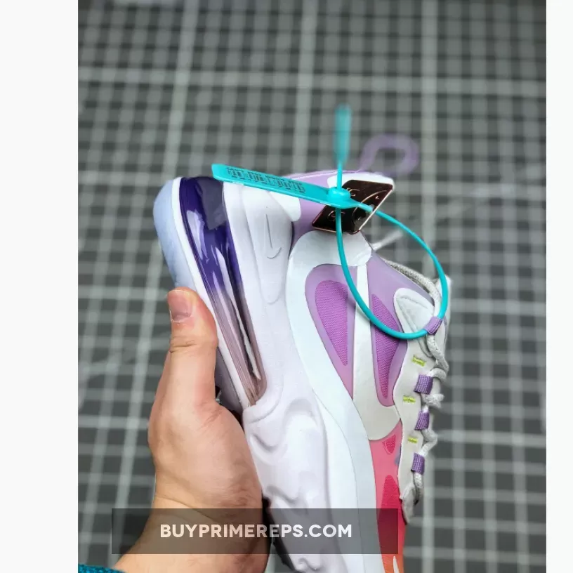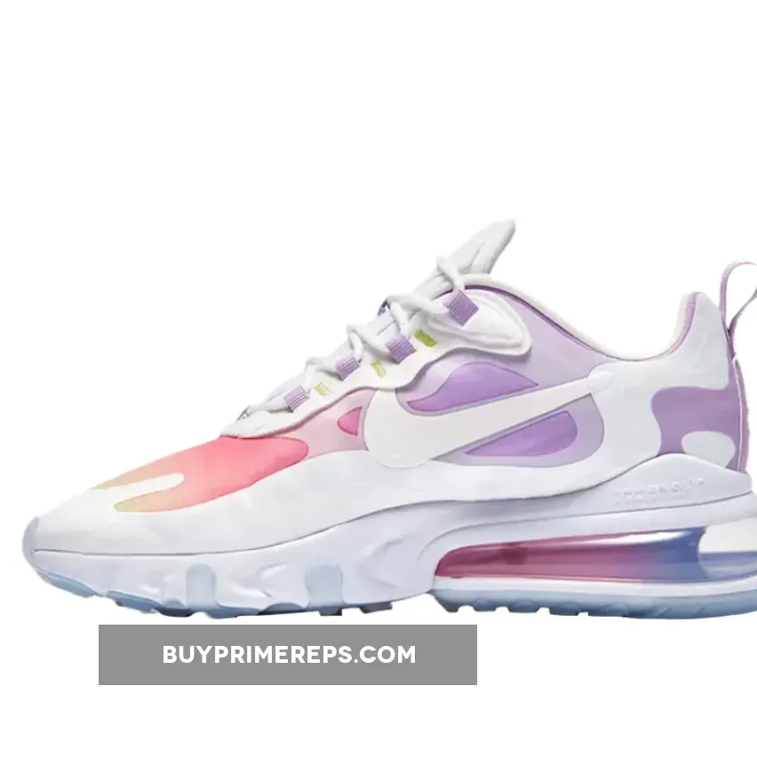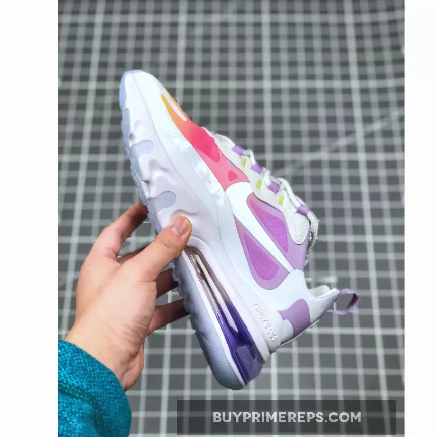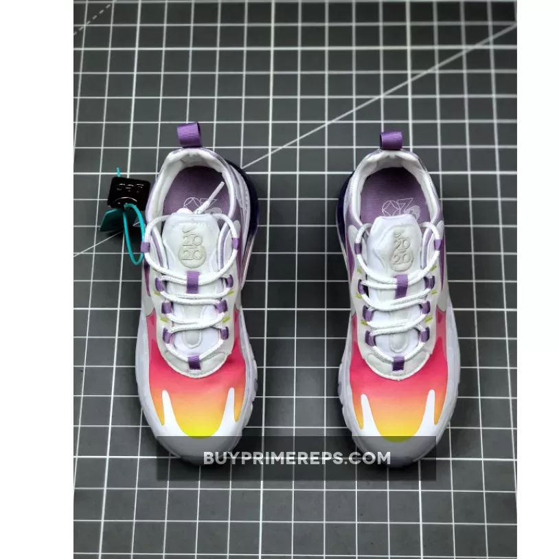 The no-sew design of the upper creates a seamless and sleek aesthetic, with soft white overlays that make the colorful panels stand out even more. The React foam midsole ensures a lightweight and cushioned feel with every step, while the grippy outsole provides traction and stability. White Swooshes appear on both the medial and lateral sidewalls, adding a touch of contrast to the vibrant gradient color scheme.