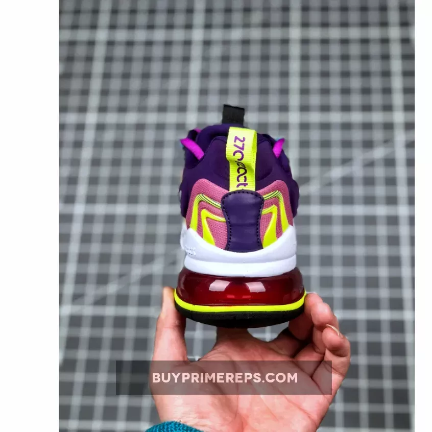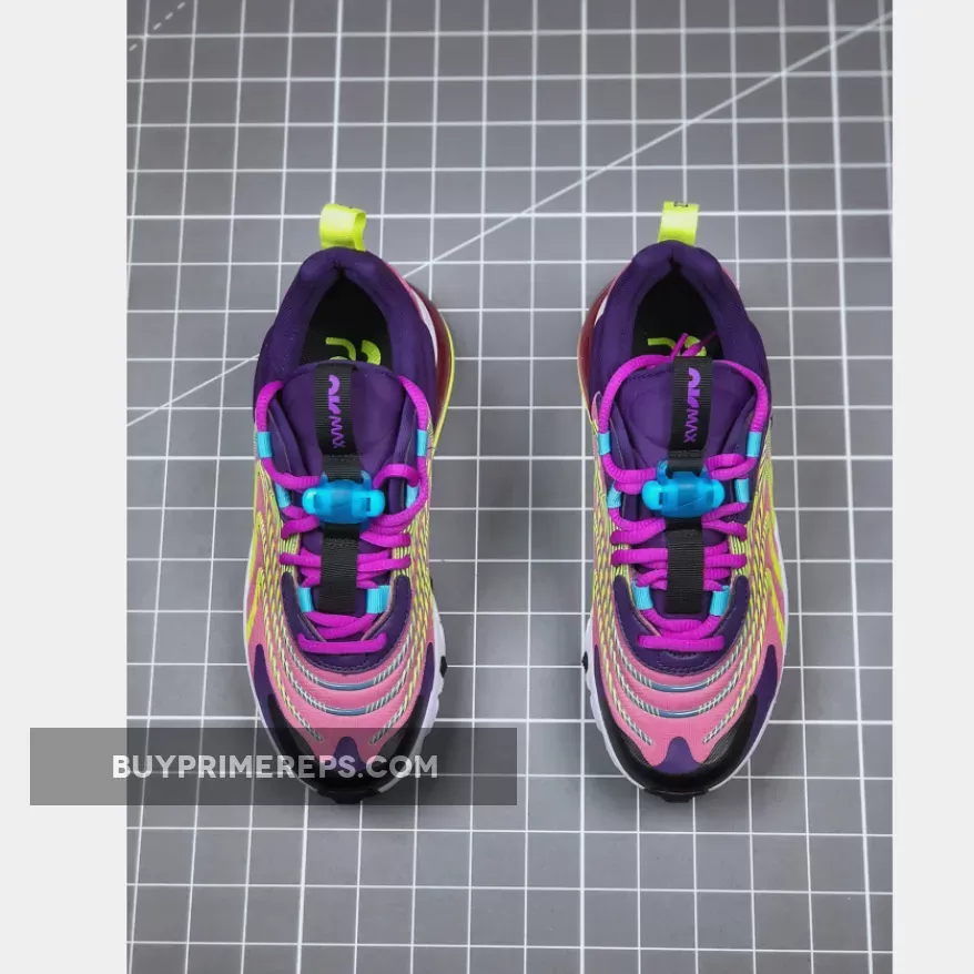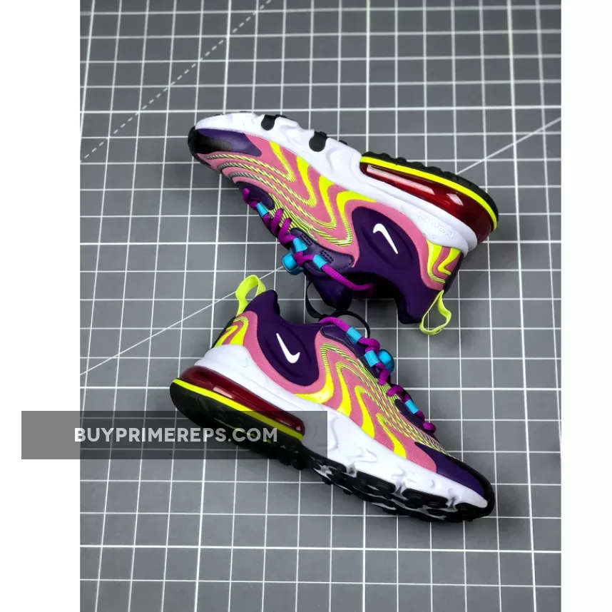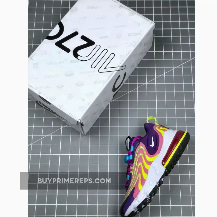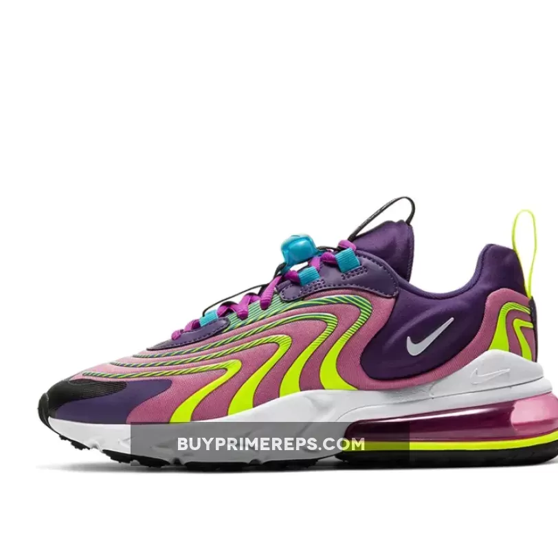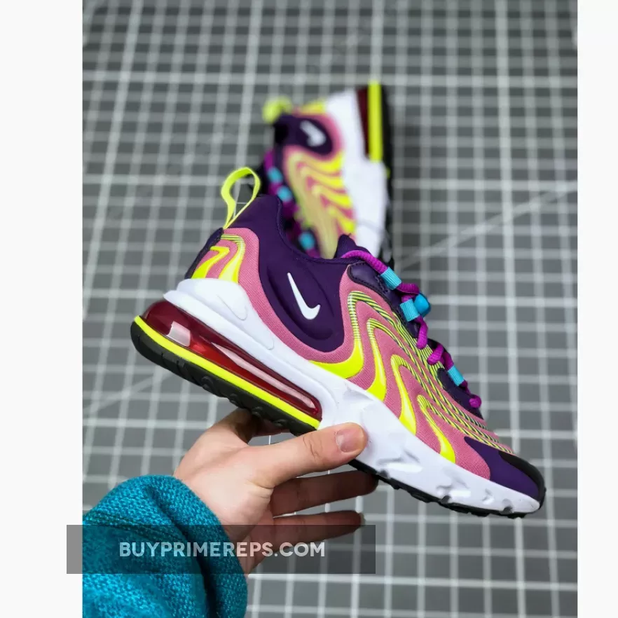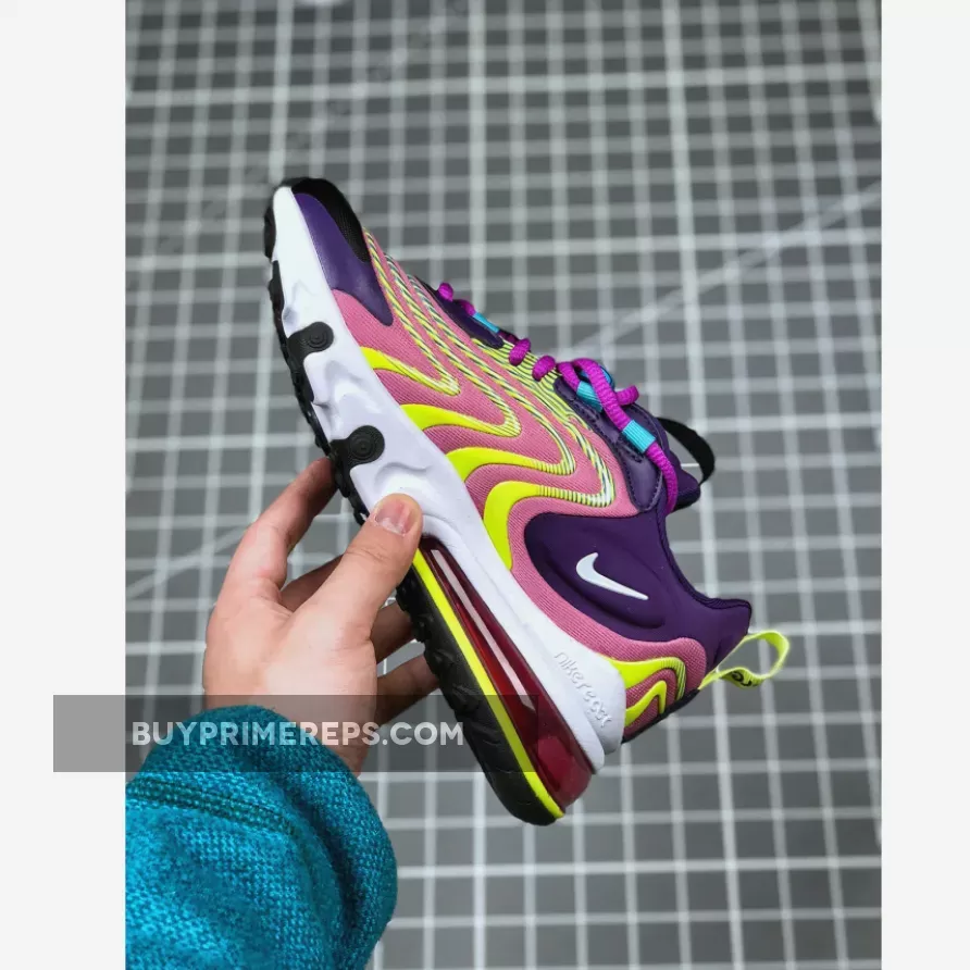 Introducing the Nike Air Max 270 React ENG Multi, a vibrant and functional sneaker that combines modern style with ultimate comfort. This updated version of the classic Air Max silhouette is adorned with a colorful mix of purple, lime green, and other eye-catching hues, giving it a bold and energetic look. With its high-voltage details and unique color scheme, this shoe is sure to turn heads wherever you go.