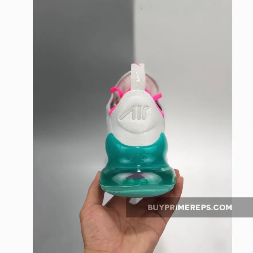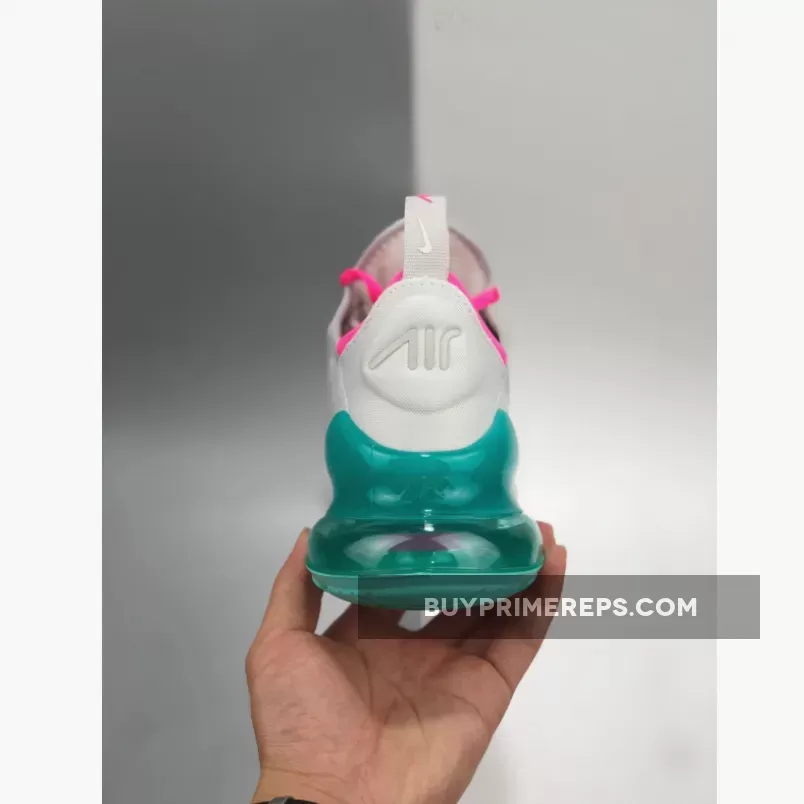 The standout feature of the Air Max 270 Pure Platinum Pink Blast is the bold pops of color that adorn the shoe. The white Swoosh logos on the sides of the shoe add a touch of contrast, while the pink and teal accents on the laces, sock liners, and Air-infused cushioning units bring a vibrant and tropical vibe to the overall design. This combination of colors gives the shoe a unique and refreshing look, perfect for those who want to add a splash of color to their outfit.