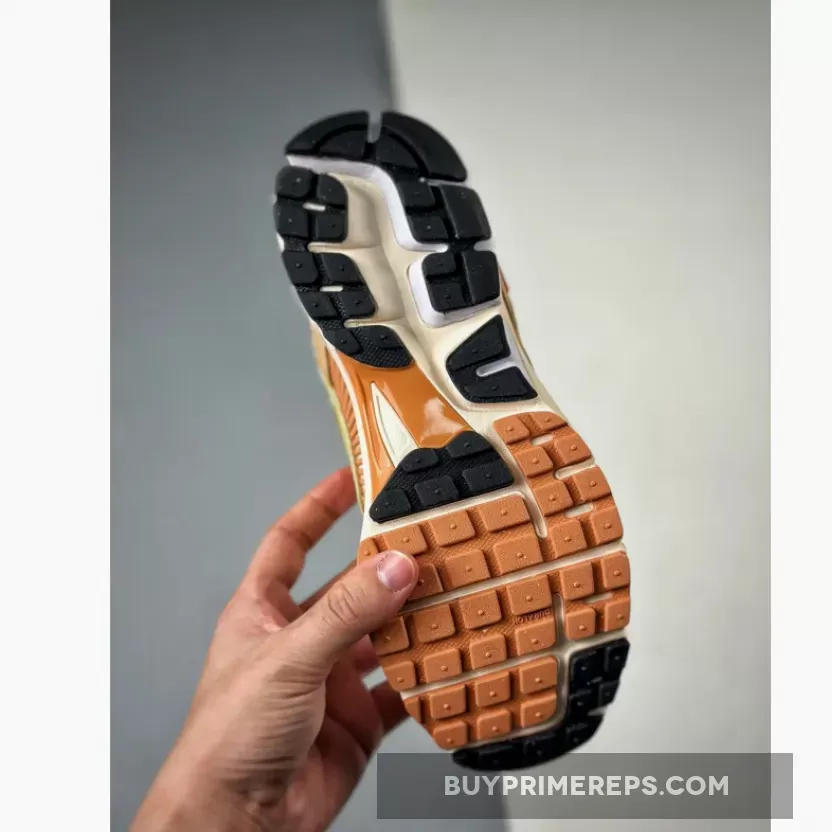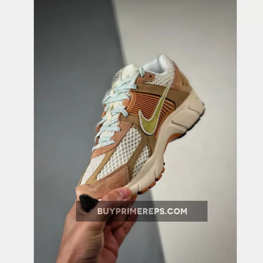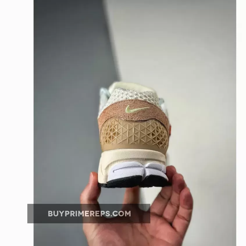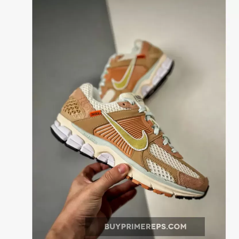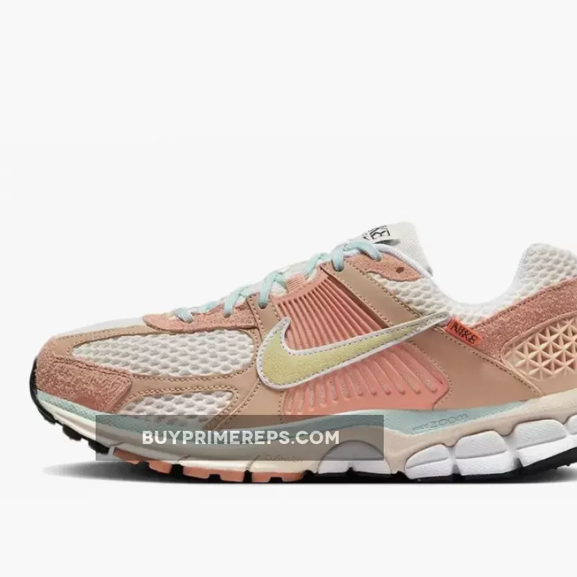 The Zoom Vomero 5 features an understated off-white mesh foundation, which serves as the perfect backdrop for the muted tones of tan and peach pastel leather and suede overlays. These materials not only enhance the shoe’s aesthetic appeal but also provide durability and support. The TPU panel cages at the mid-panels and heels match the peach tones, adding a touch of color to the design.