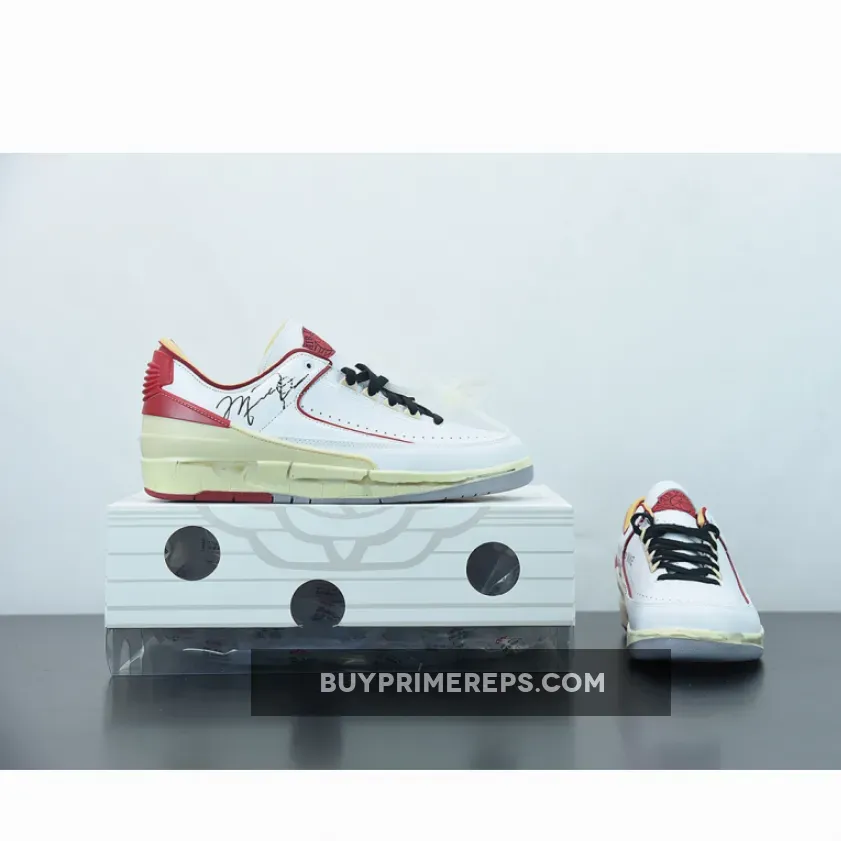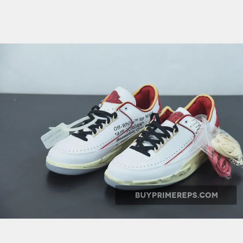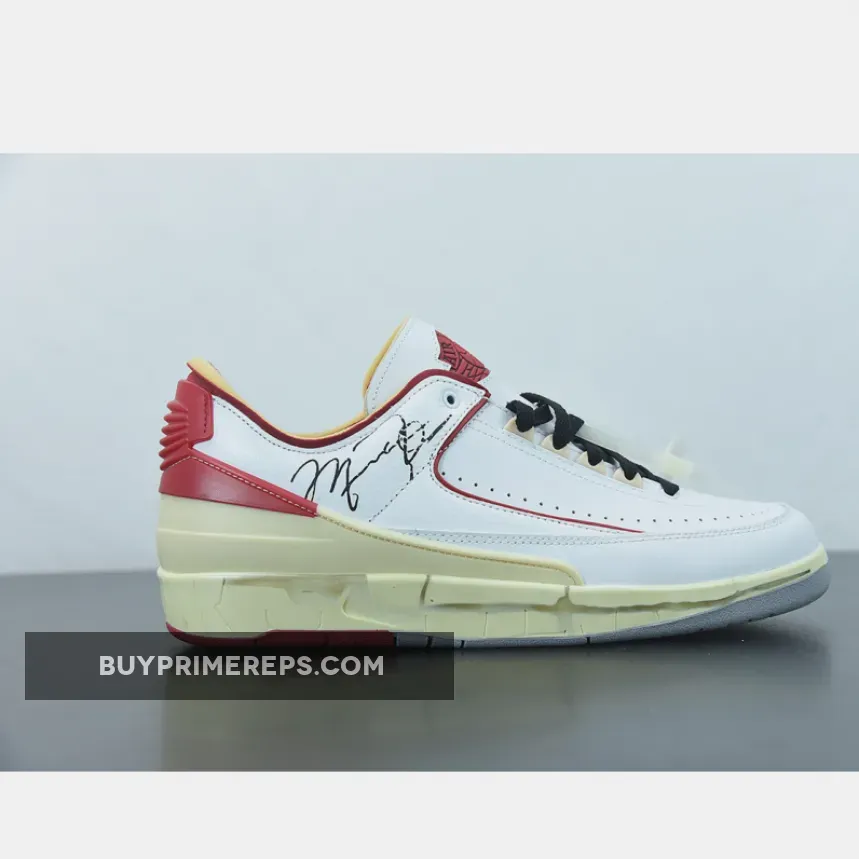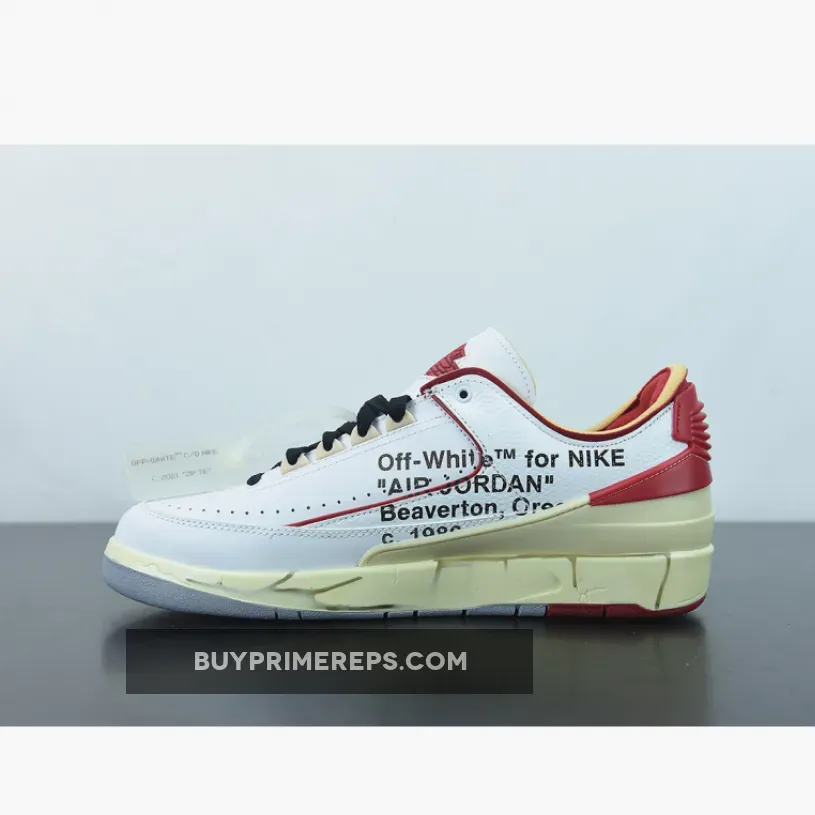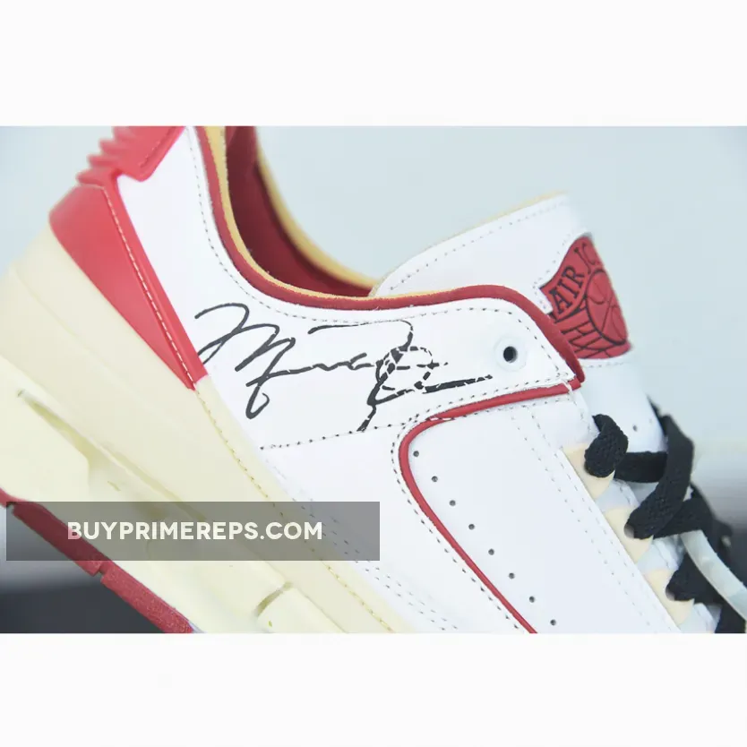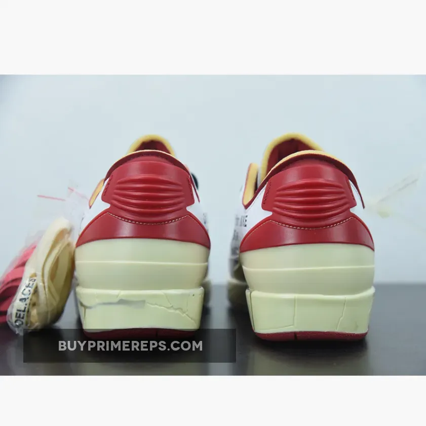 The design of the Off-White x Air Jordan 2 Low White Red stays true to the original Air Jordan 2 silhouette but adds a fresh and modern twist. The upper is predominantly white, with red accents adding a pop of color. The use of premium materials and attention to detail is evident, with the sneaker exuding a luxurious feel.