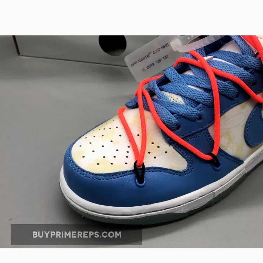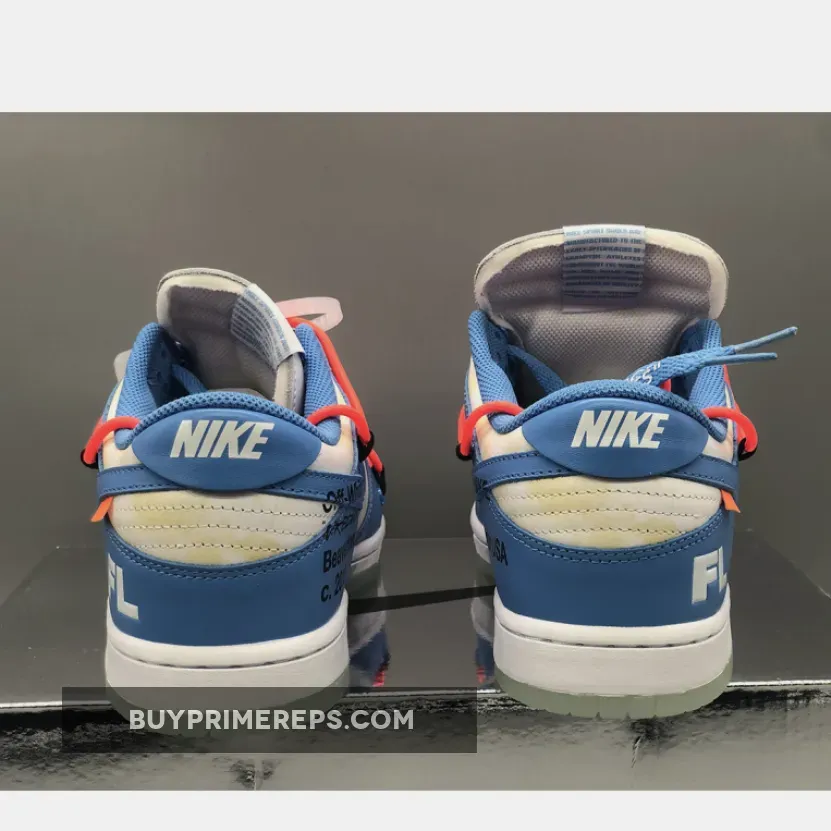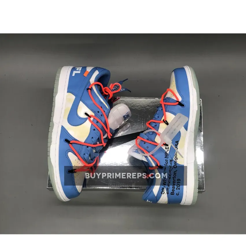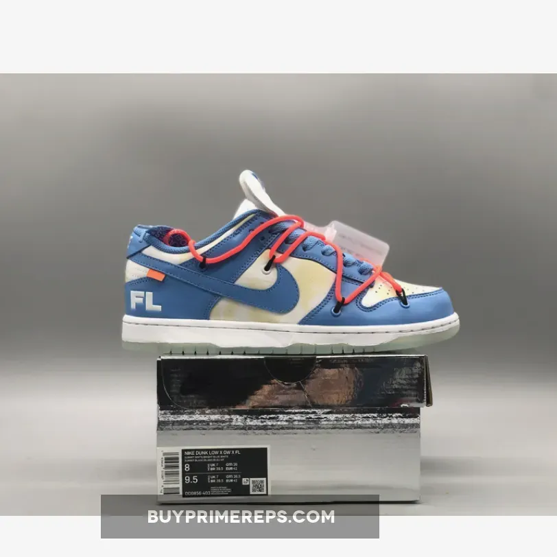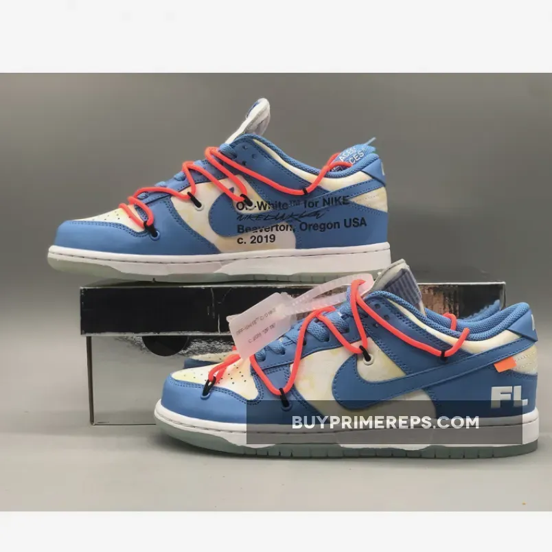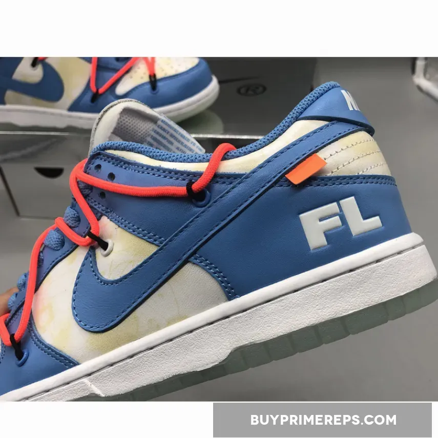 This particular colorway of the Off-White x Futura x Nike SB Dunk Low draws inspiration from the University of North Carolina (UNC), known for its iconic baby blue and white color scheme. The sneaker features a combination of baby blue and white on its upper, creating a clean and classic look. The collaboration stays true to Abloh’s signature design elements, such as the overlaid lacing system in neon orange and the black medial c/o text.