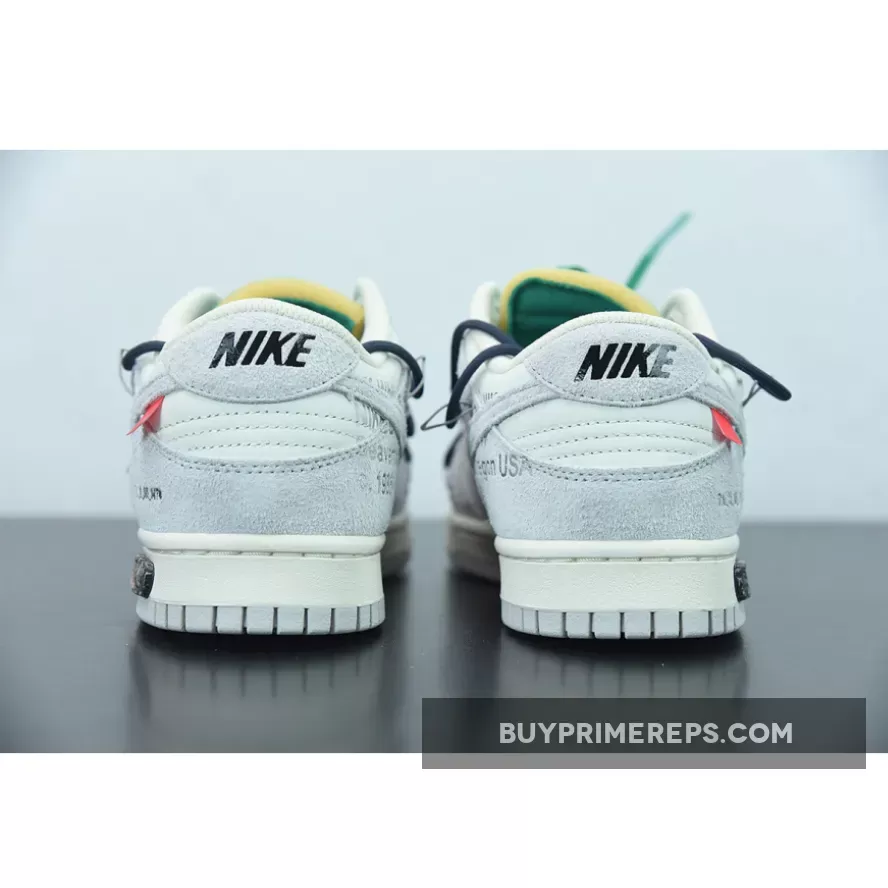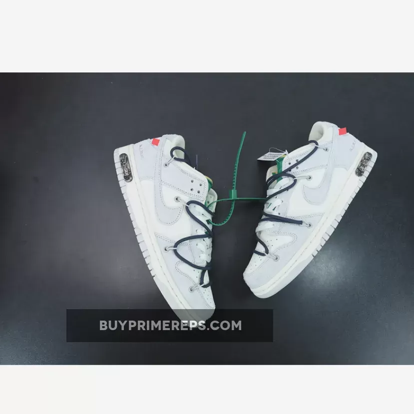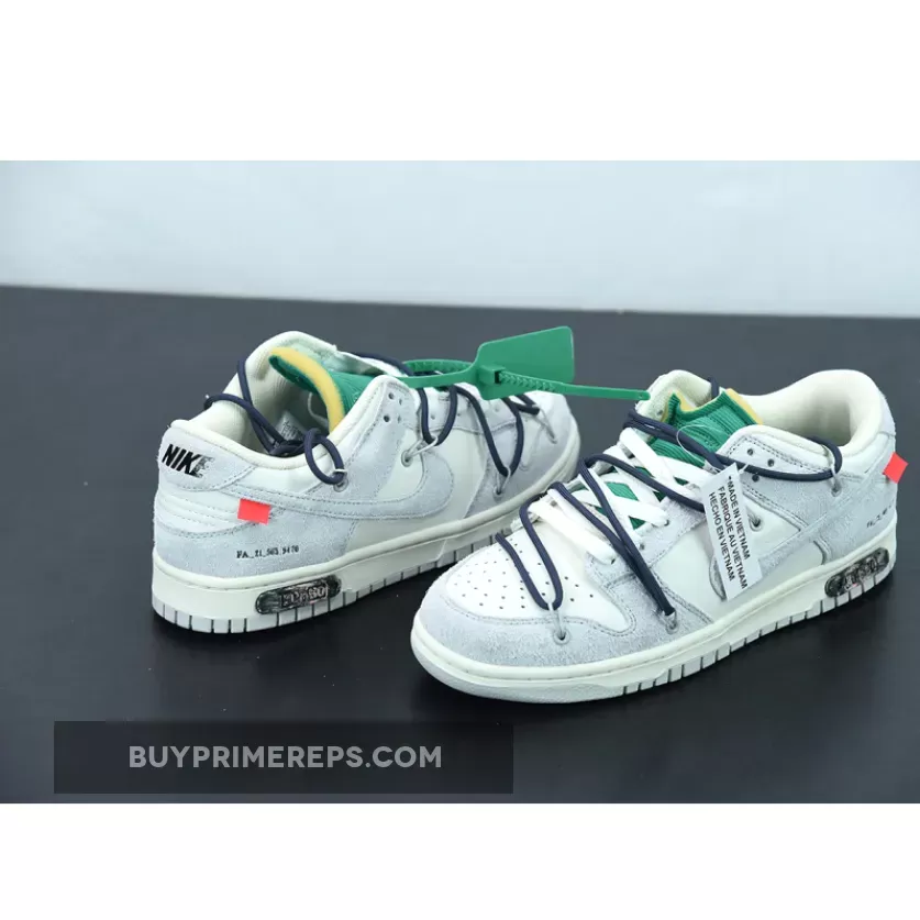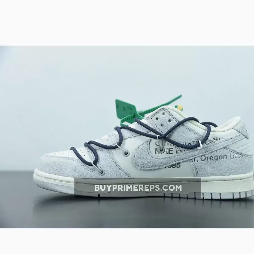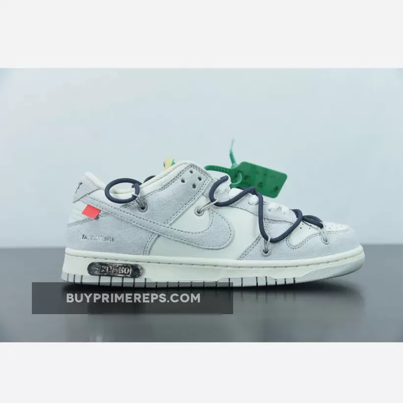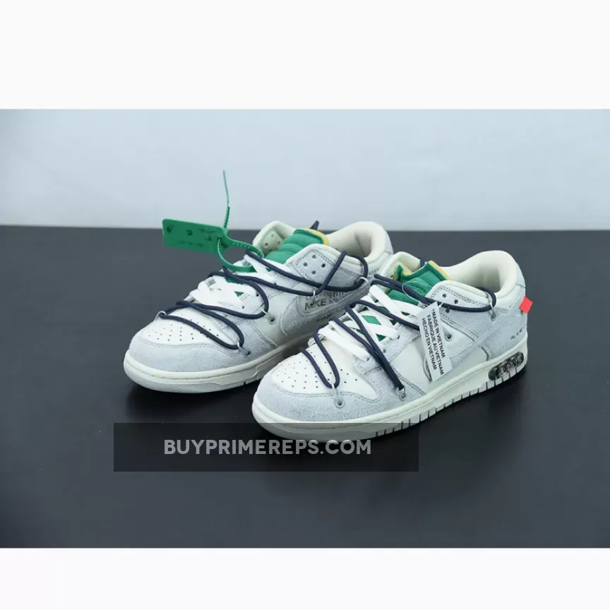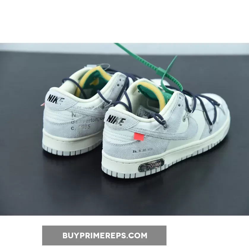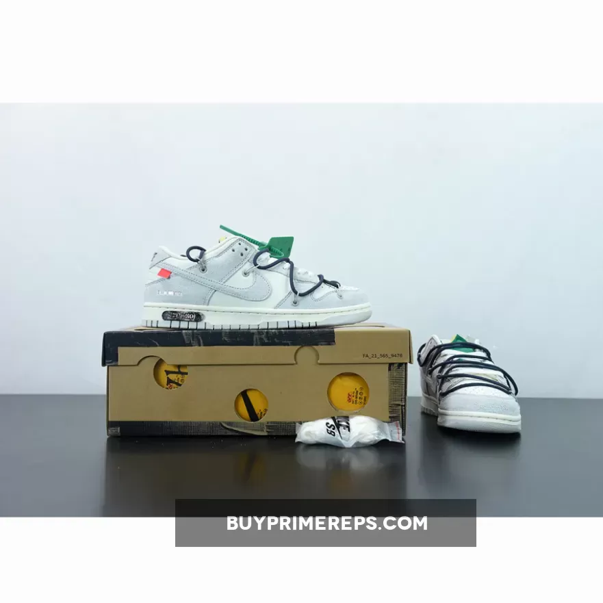 The highly anticipated Off-White x Nike Dunk Low sneakers from the ‘Dear Summer’ collection are finally here, and they do not disappoint. These low-top sneakers feature a classic white leather upper with soft grey suede overlays, giving them a clean and timeless look. But it wouldn’t be an Off-White collaboration without Virgil Abloh’s signature touches.