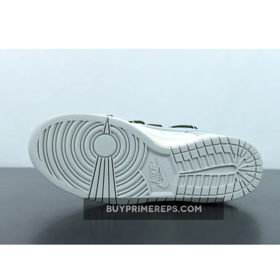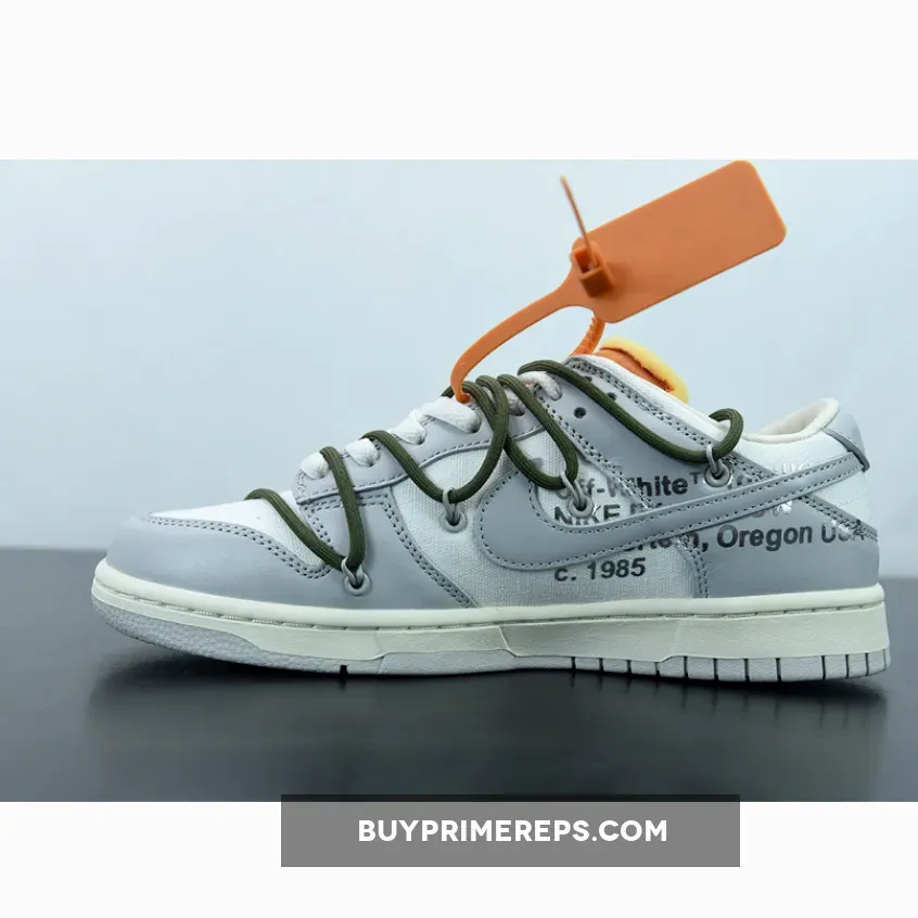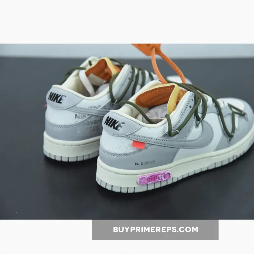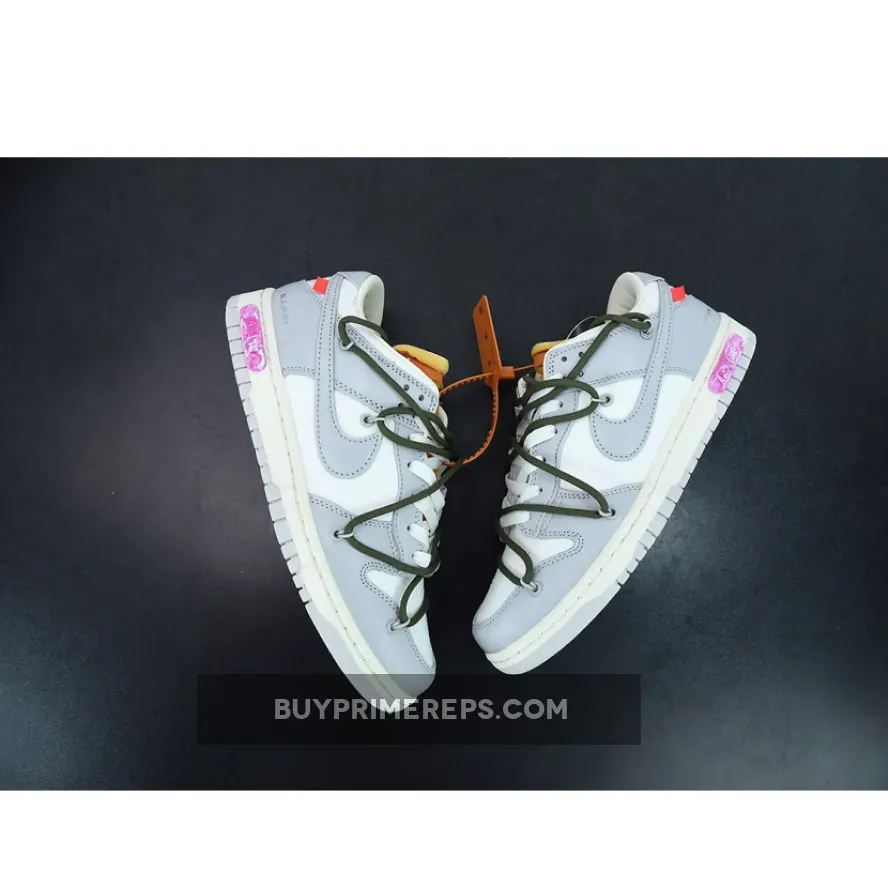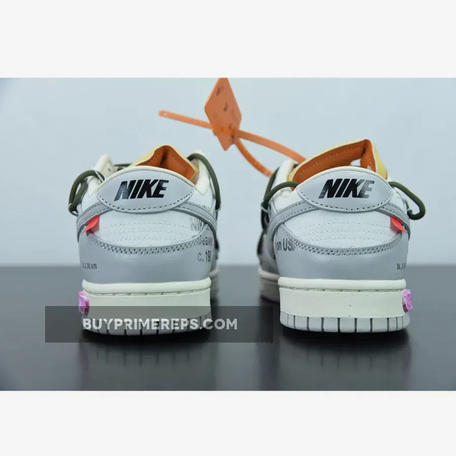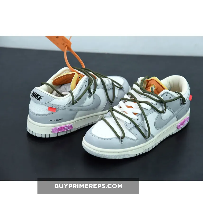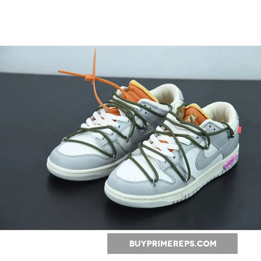 The Off-White x Nike Dunk Low ’22 of 50 Sail Neutral Grey Medium Olive’ is part of the highly sought-after ‘Dear Summer’ collection, which serves as a follow-up to Virgil Abloh’s initial Nike Dunk collaboration in 2019. This low-top sneaker features a sleek and clean design, combining a white leather upper with soft grey canvas overlays.