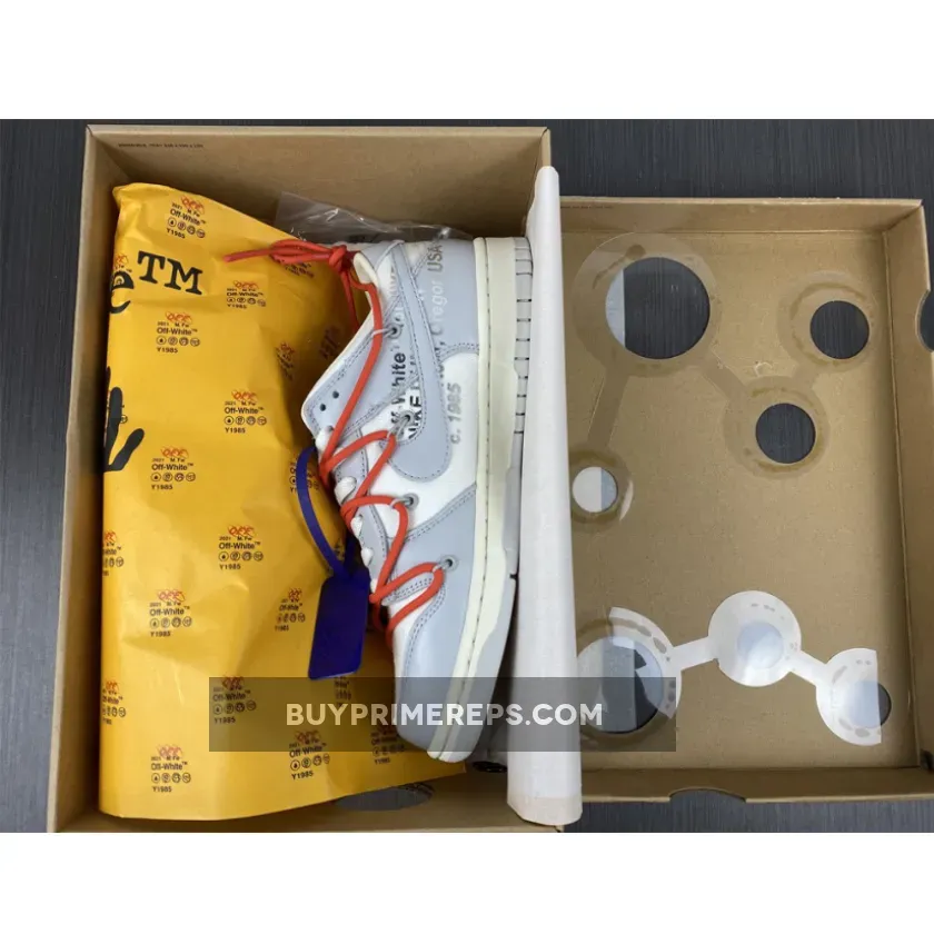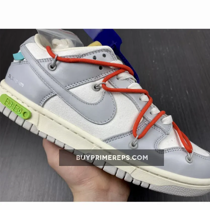 The design of the Nike Dunk Low Off-White Lot 23 features a combination of premium materials and intricate detailing. The upper is constructed with a Sail canvas base, providing a clean and understated look. Contrasting the canvas, Neutral Grey leather is used on the collar, toe cap, eyelets, forefoot, and heel, adding a luxurious touch to the overall design.