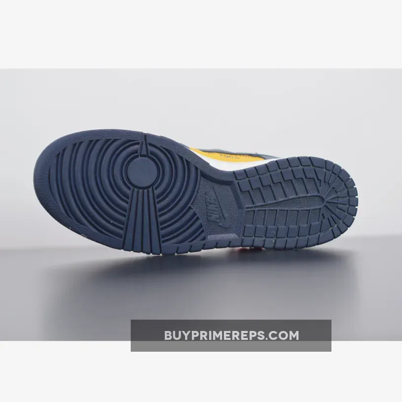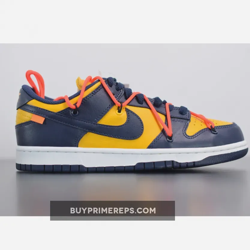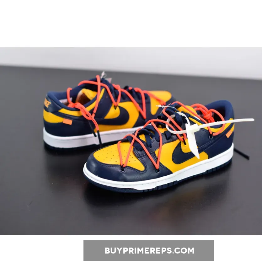 The Off-White x Nike Dunk Low “University Gold” is a highly anticipated collaboration between Virgil Abloh’s fashion label Off-White and sportswear giant Nike. This release is part of a three-piece capsule featuring unique colorways of the iconic Dunk Low silhouette. The “University Gold” edition is a bold and eye-catching sneaker that combines a vibrant yellow leather base with contrasting navy overlays.