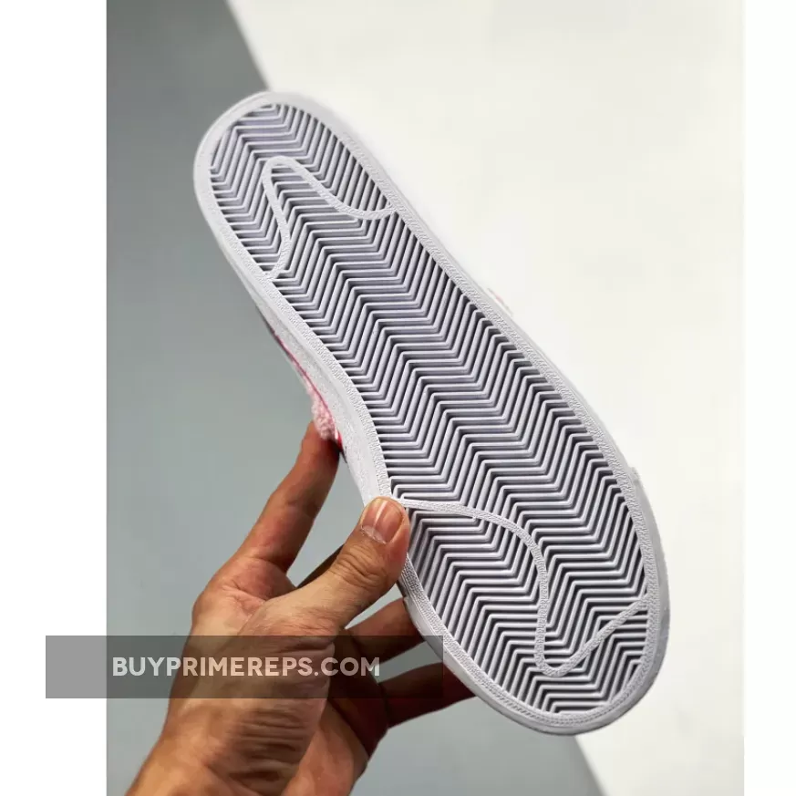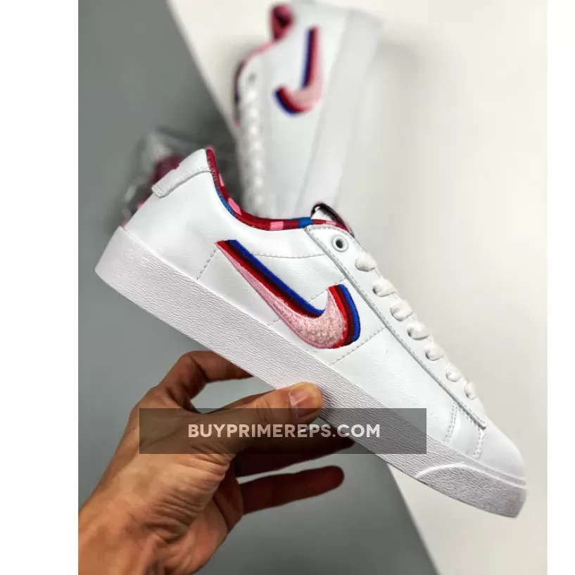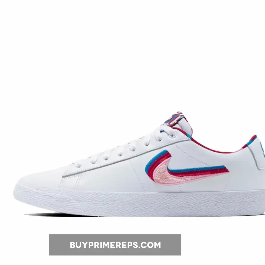 The Blazer Low features a hard-wearing canvas upper in a pristine white colorway, providing a clean and fresh look. Parra’s iconic color palette of white, pink, red, and blue is incorporated throughout the shoe, adding a vibrant and eye-catching contrast. The triple Swoosh branding on the lateral and medial side walls is a standout feature, with each Swoosh crafted from chenille material for added depth and texture.