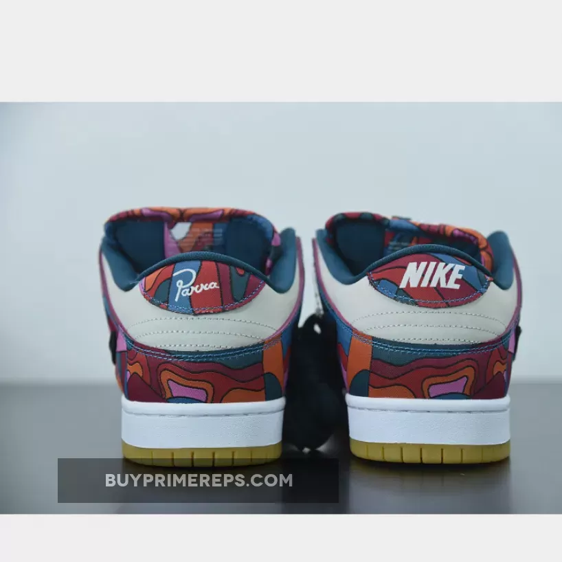 The design of the Parra x Nike Dunk Low SB is truly one-of-a-kind. The shoe features an off-white leather upper, giving it a clean and classic look. However, the real standout feature of this sneaker is the abstract-print textile overlays, which come in a vibrant mix of blue, red, pink, and teal hues. These colorful overlays create a striking and artistic visual effect, making this shoe a true work of art.