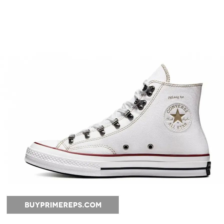 Alongside the Chuck 70, the pgLang x Converse collaboration also includes a revamped version of the Pro Leather, featuring a suede upper and hiking-style eyelets. The “pgLang” branding is embossed alongside the Star Chevron, showcasing the attention to detail and unique design elements that define this collection.